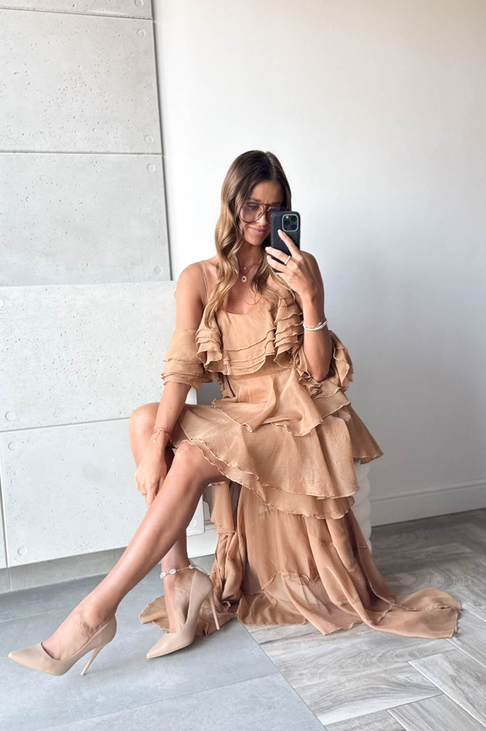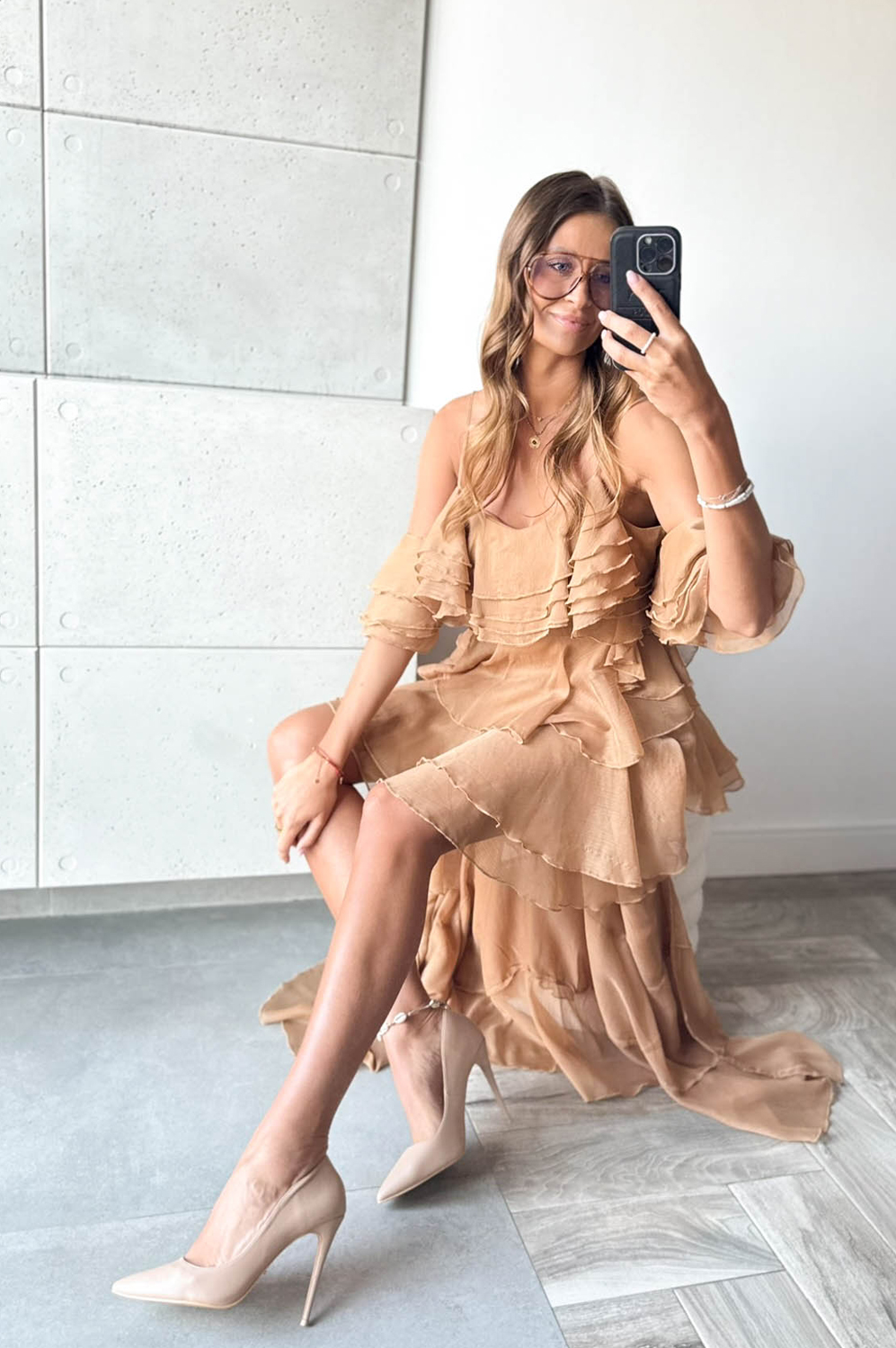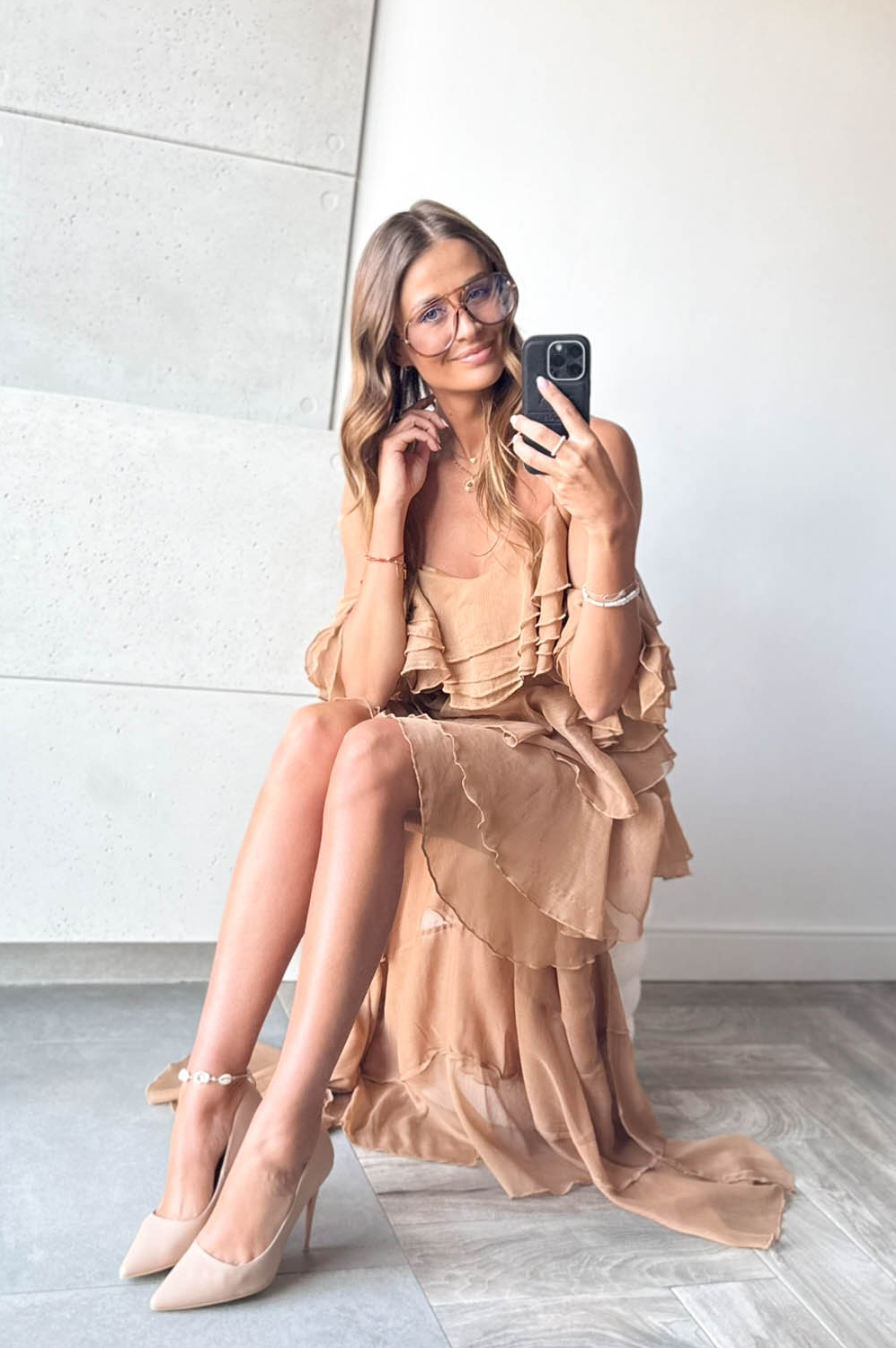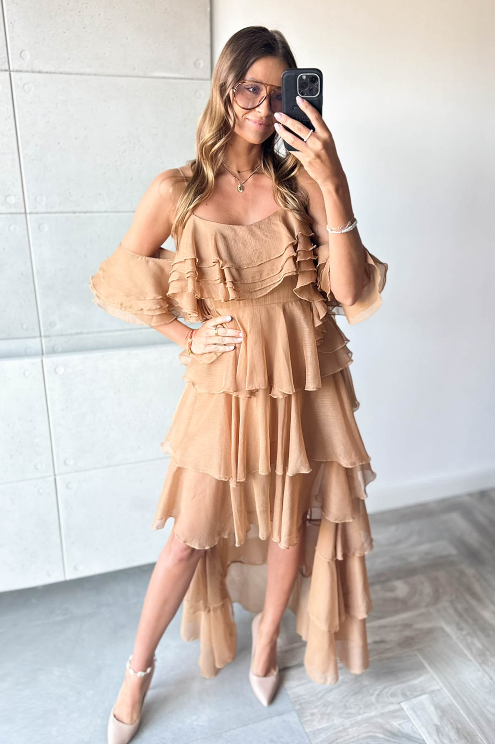 Sukienka HISZPANKA FALBANY karmel269.00 zł Najniższa cena towaru, która obowiązywała w okresie 30 dni przed zastosowaniem obniżki: 269.00 zł Opis Sukienka hiszpanka z falbanami. Wykonana z tkaniny. Zapinanana na kryty zamek z boku. SKŁAD : 100% POLIESTER