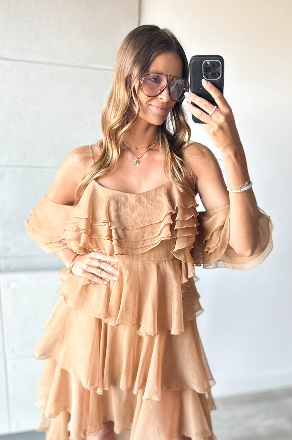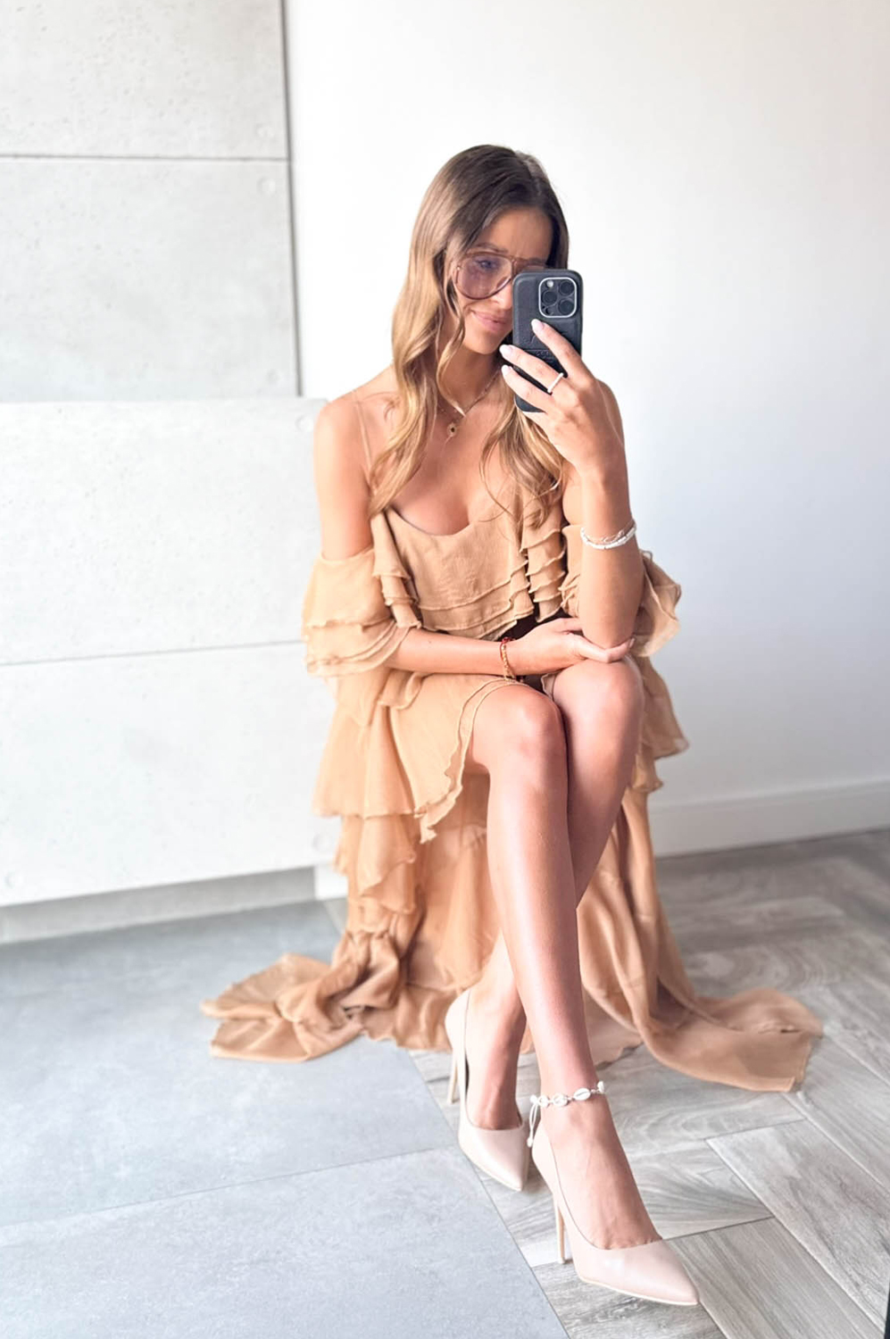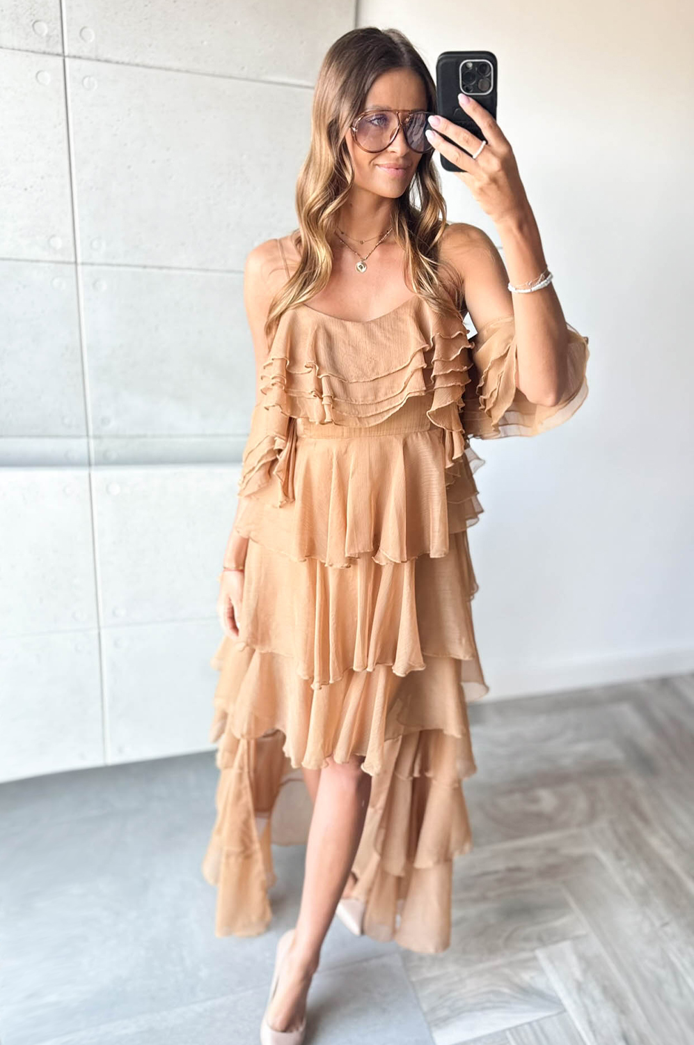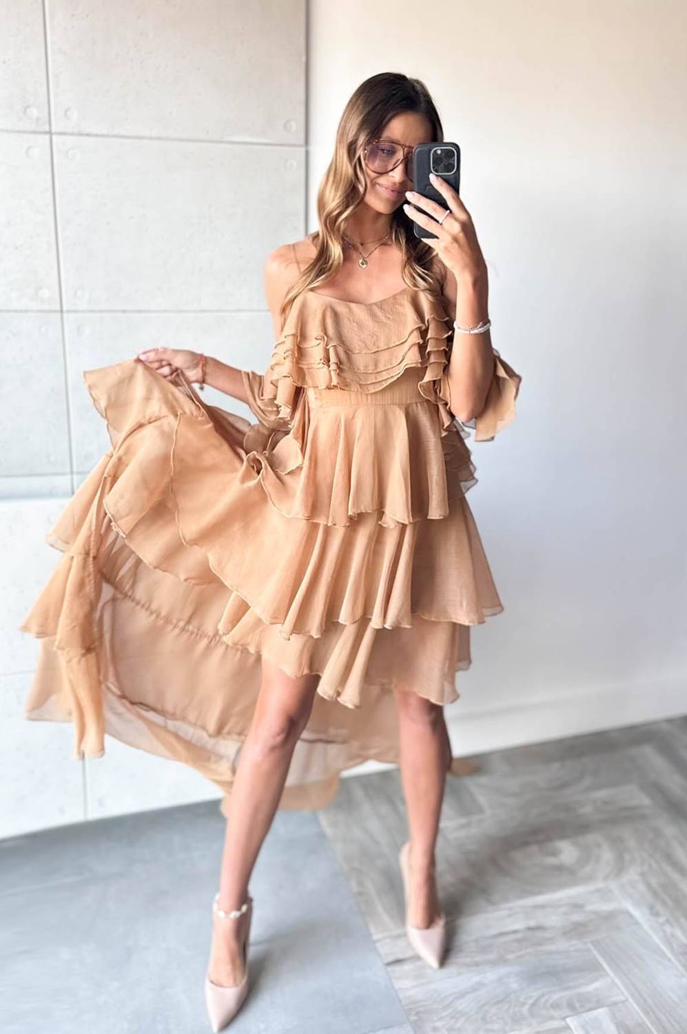Sukienka HISZPANKA FALBANY karmel269.00 zł Najniższa cena towaru, która obowiązywała w okresie 30 dni przed zastosowaniem obniżki: 269.00 zł Opis Sukienka hiszpanka z falbanami. Wykonana z tkaniny. Zapinanana na kryty zamek z boku. SKŁAD : 100% POLIESTER