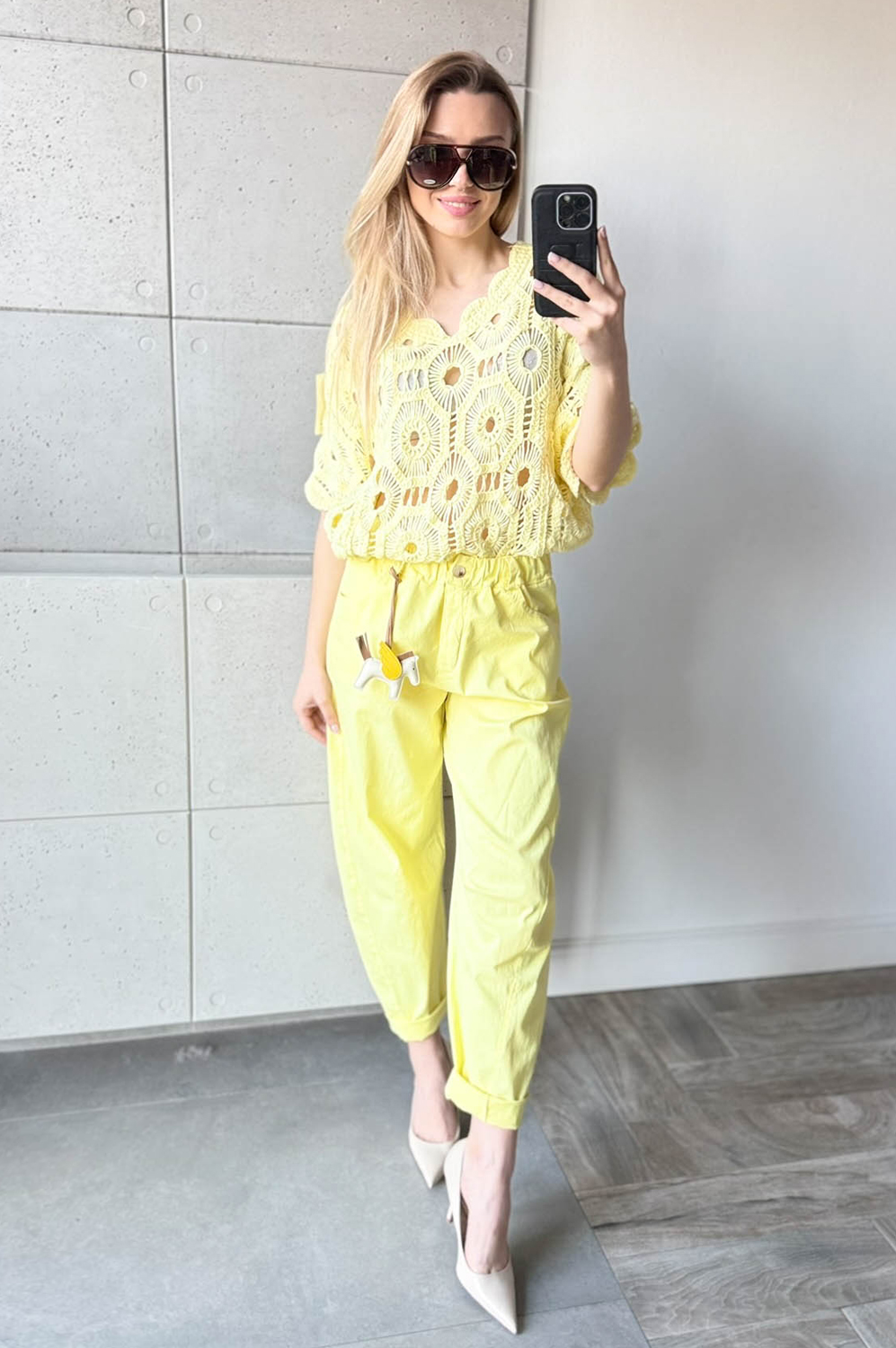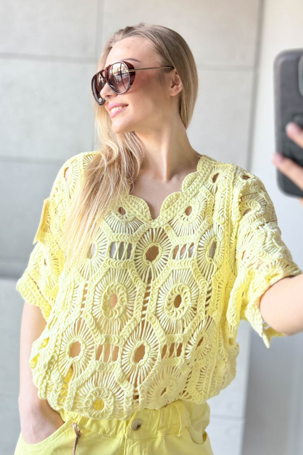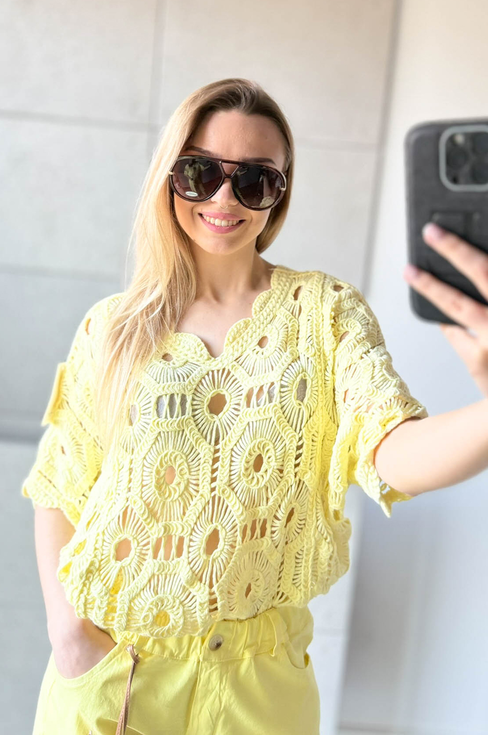 Bluzka AŻUR W KWIATY pastelowa cytrynka99.00 zł Najniższa cena towaru, która obowiązywała w okresie 30 dni przed zastosowaniem obniżki: 99.00 zł Opis Sweterek z krótkim rękawkiem i dekoltem w szpic. Sweterek jest miękki i przyjemny w dotyku. Przewiewny i wykonany z bawełny. WYMIARY: długość: 62 cm, szerokość: 100-106 cm