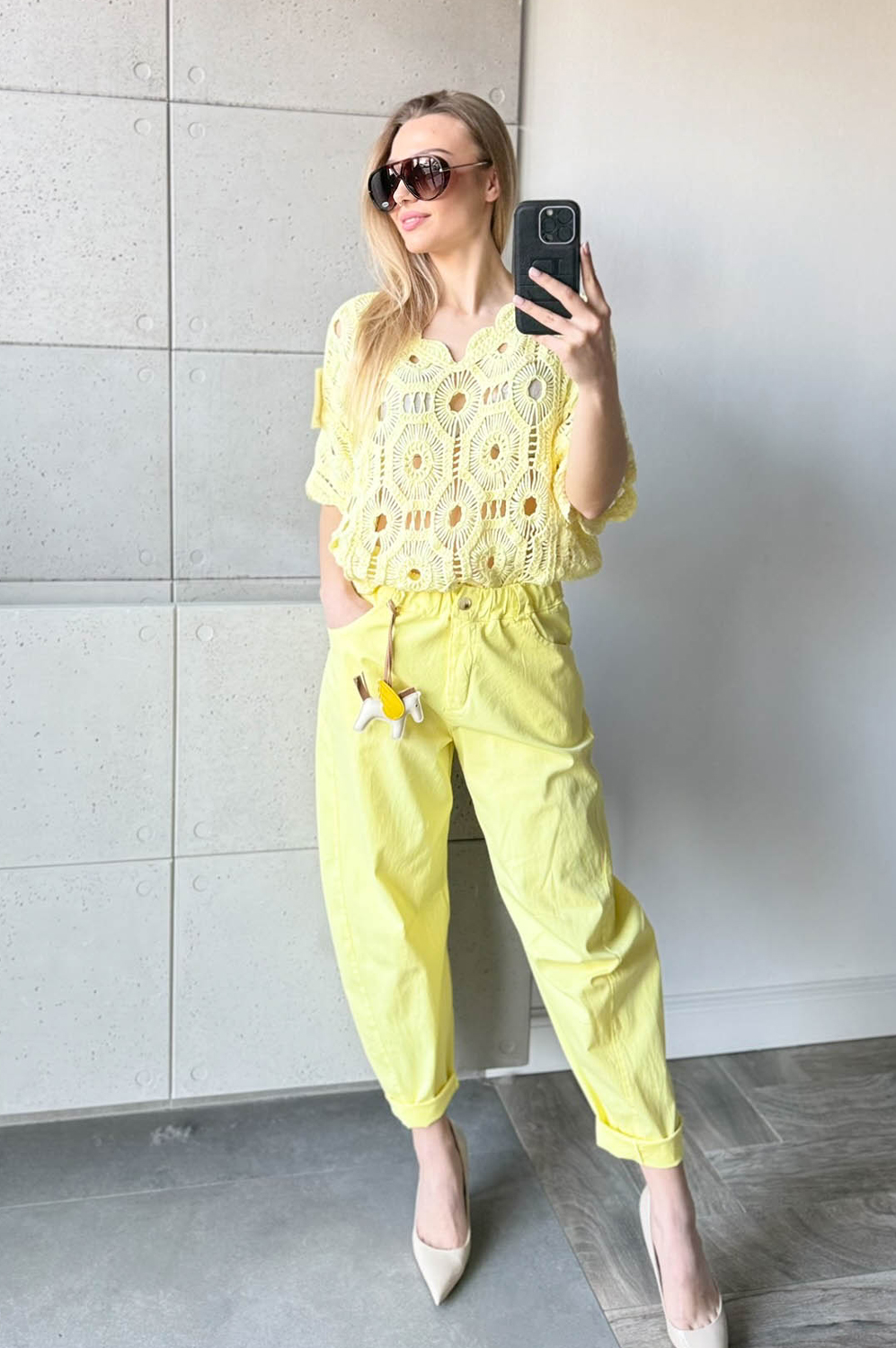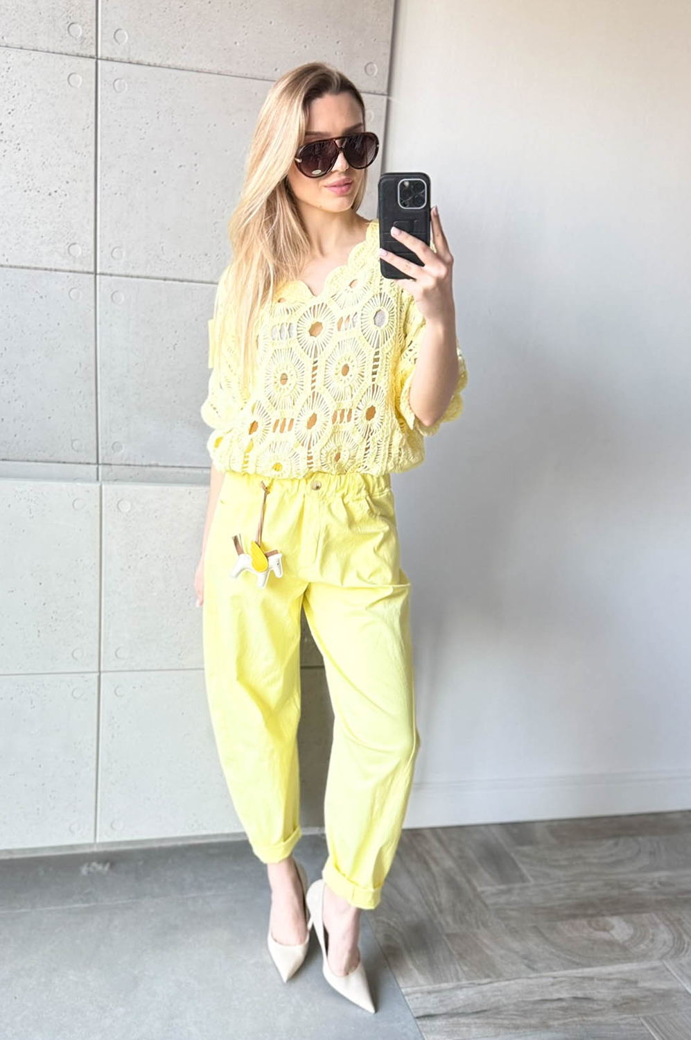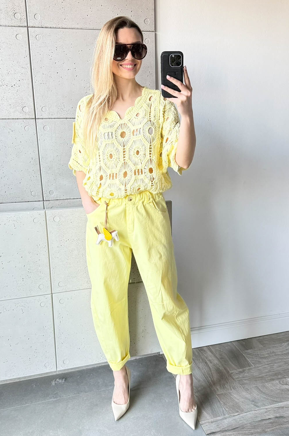 Bluzka AŻUR W KWIATY pastelowa cytrynka99.00 zł Najniższa cena towaru, która obowiązywała w okresie 30 dni przed zastosowaniem obniżki: 99.00 zł Opis Sweterek z krótkim rękawkiem i dekoltem w szpic. Sweterek jest miękki i przyjemny w dotyku. Przewiewny i wykonany z bawełny. WYMIARY: długość: 62 cm, szerokość: 100-106 cm