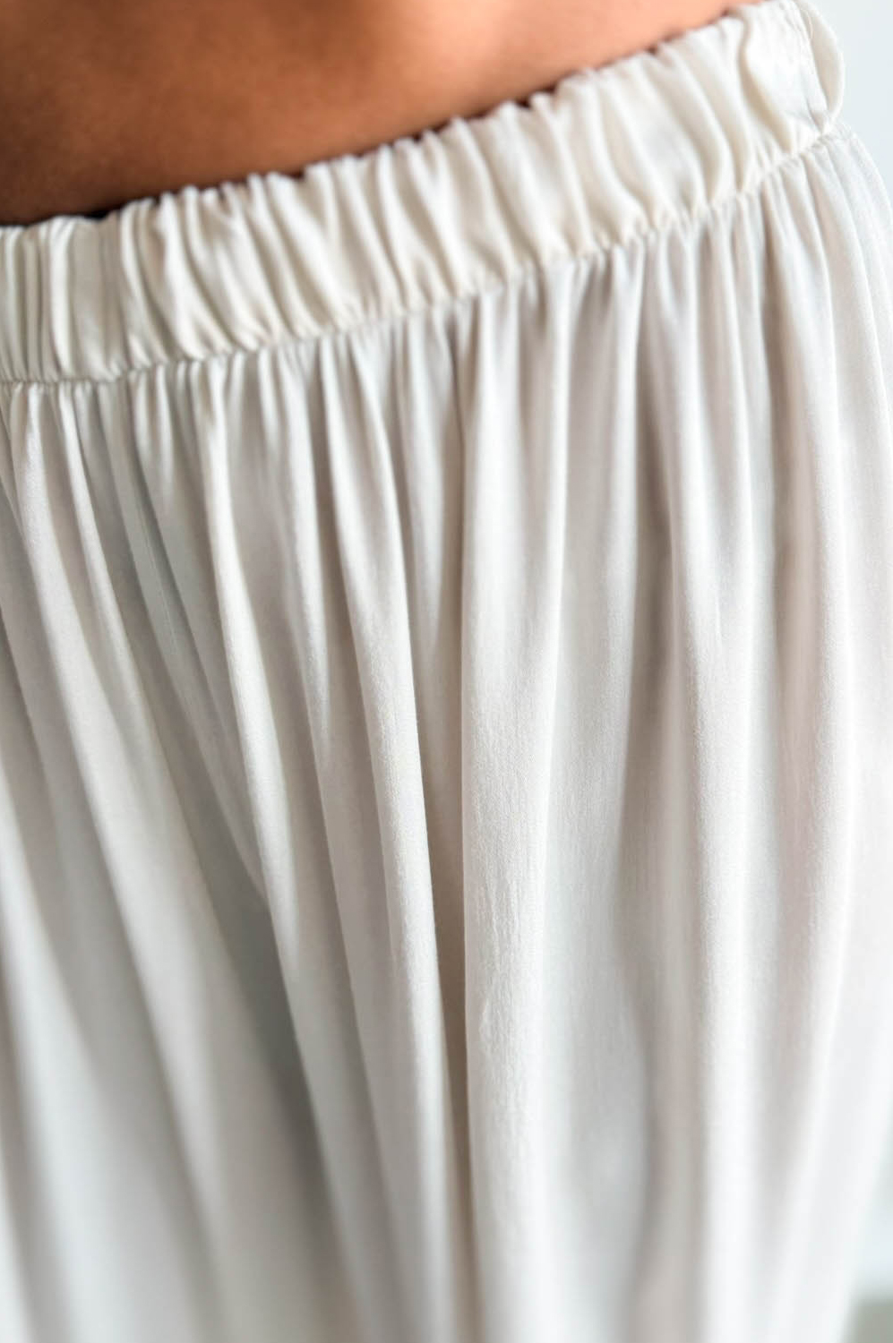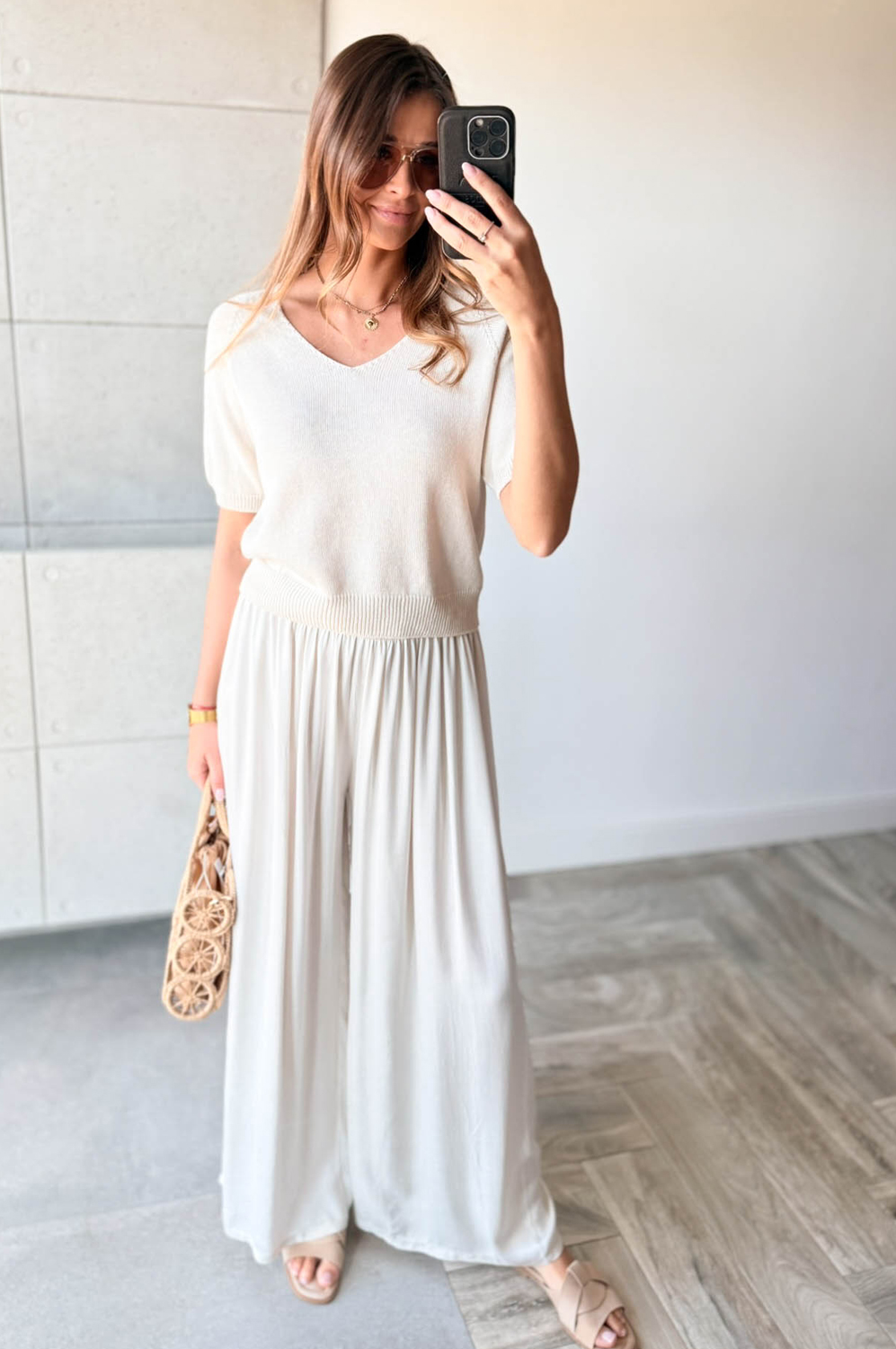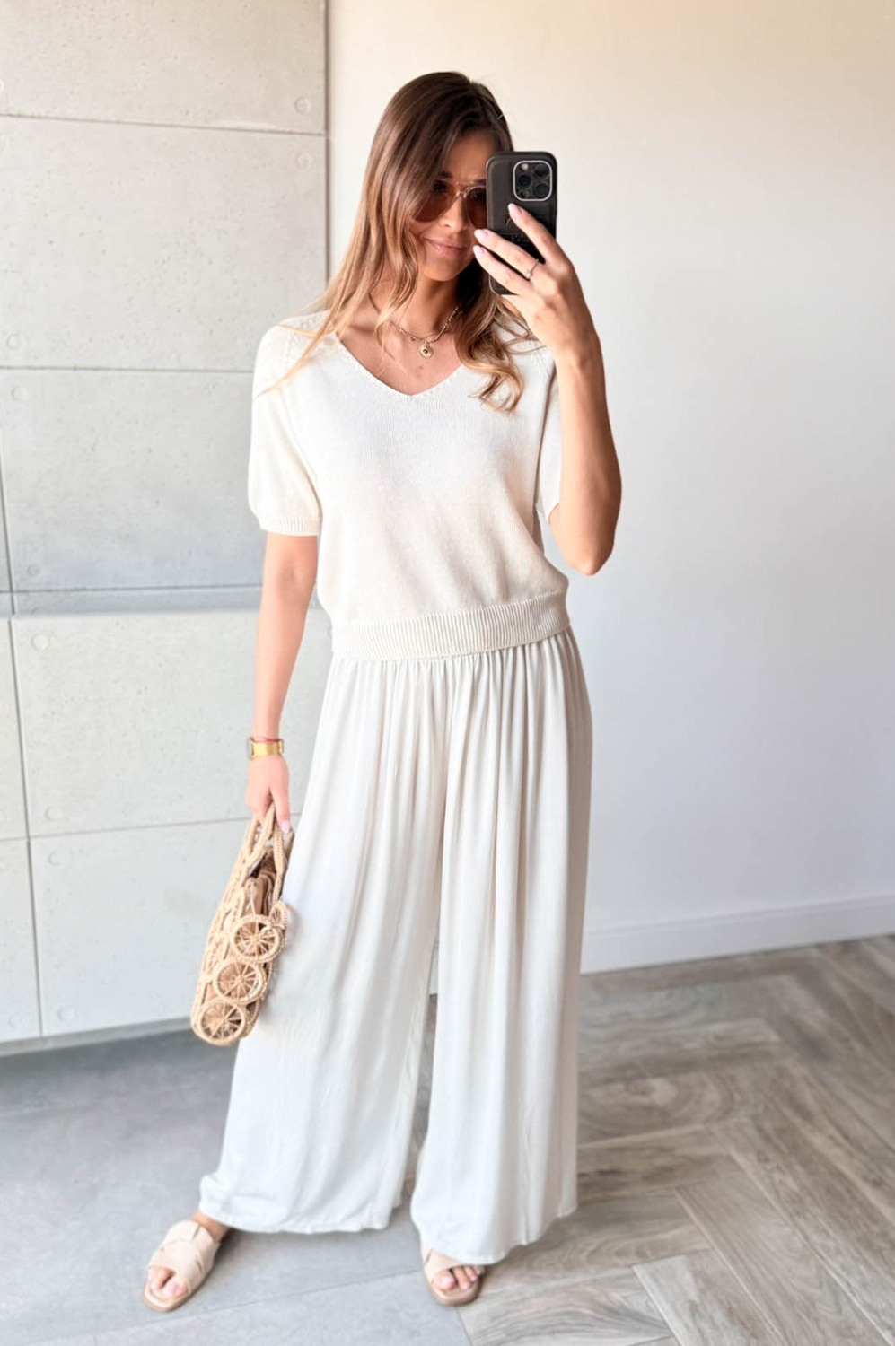 Spodnie MOMO LEJĄCE WISKOZOWE piaskowy beż119.00 zł Najniższa cena towaru, która obowiązywała w okresie 30 dni przed zastosowaniem obniżki: 119.00 zł Opis Lejące spodnie z szeroką nogawką. W pasie guma. SKŁAD : 100% wiskoza