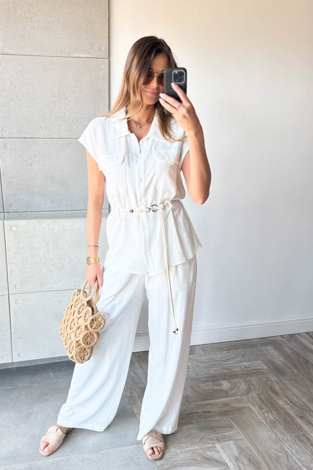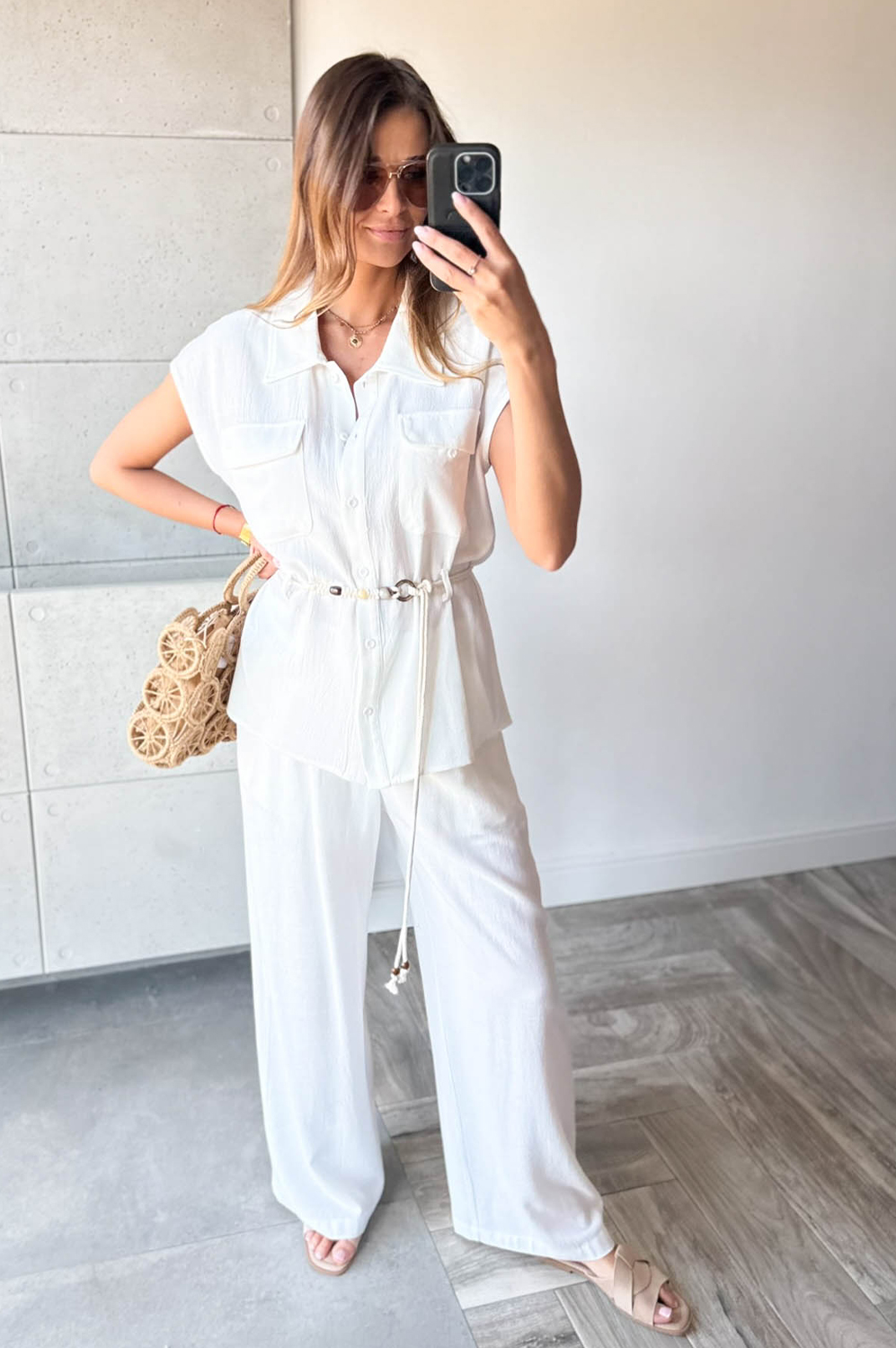 Komplet 2-częściowy KOMPLET BOHO śmietanka229.00 zł Najniższa cena towaru, która obowiązywała w okresie 30 dni przed zastosowaniem obniżki: 229.00 zł Opis Komplet dwuczęściowy, wykonany z wiskozy z dodatkiem lnu. Tkanina jest delikatna i oddychająca,bardzo przyjemna do ciała. Bluzka posiada dwie kieszonki oraz szlufki ,dodatkowo ozdobny sznurek do przewiazania.Spodnie z kieszeniami z szerszą prostą nogawką z tyłu posiadają gumkę oraz dodatkową podszewkę. WYMIARY:S/M bluzka- dł.67 biust do 102,spodnie - dł.108 pas 68-80