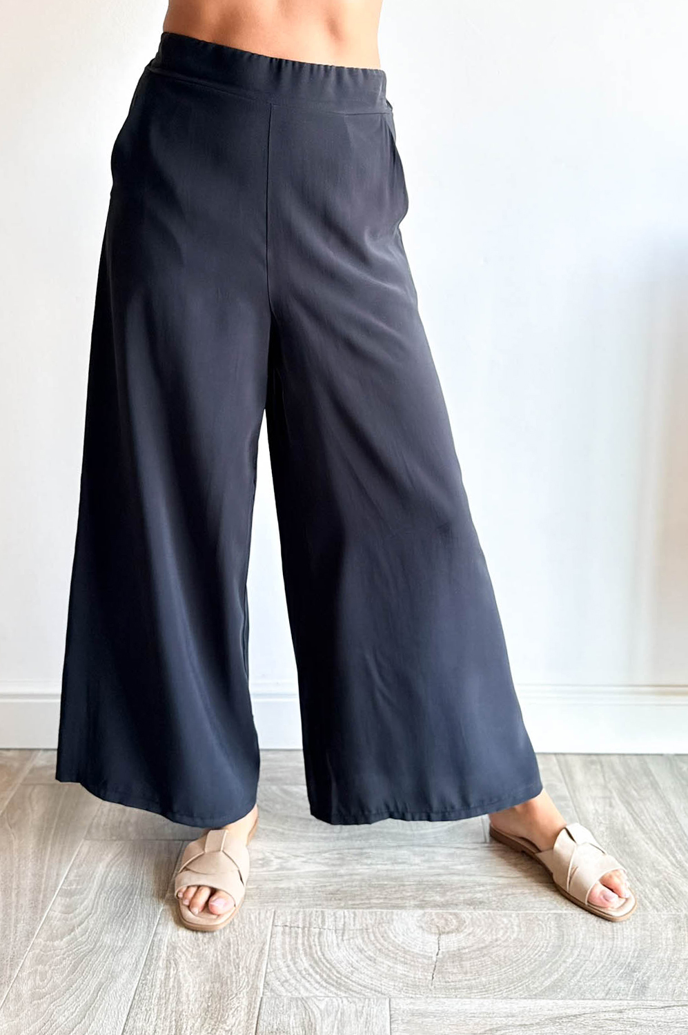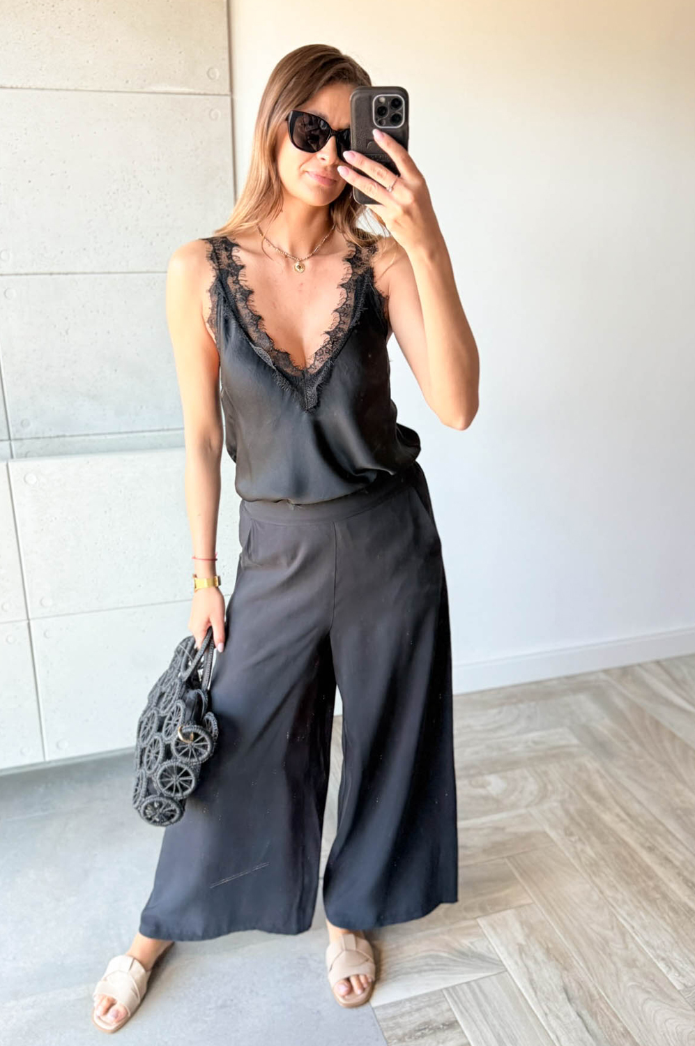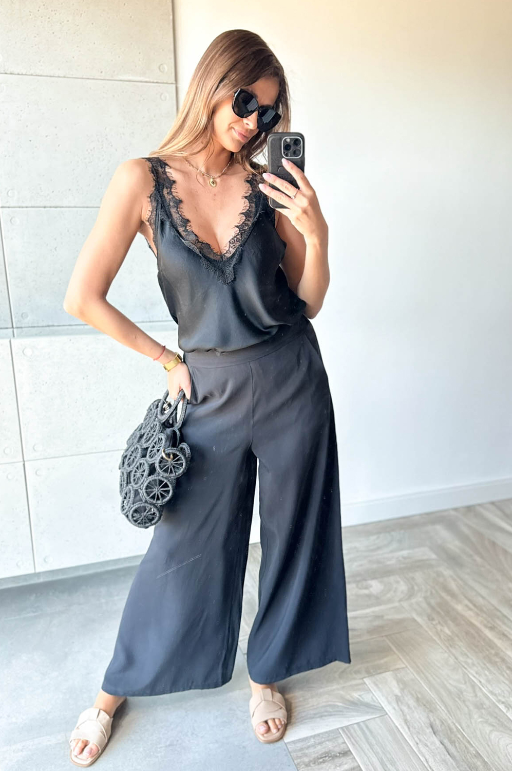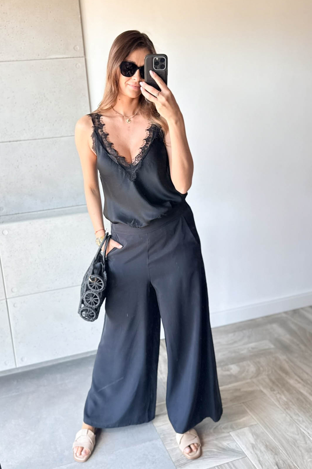 Spodnie WISKOZOWE SZEROKIE czarne159.00 zł Najniższa cena towaru, która obowiązywała w okresie 30 dni przed zastosowaniem obniżki: 159.00 zł Opis Proste spodnie wiskozowe, lużna rozszerzana nogawka,w pasie w tyle posiada gumę. SKŁAD : 85% wiskoza,15%poliester