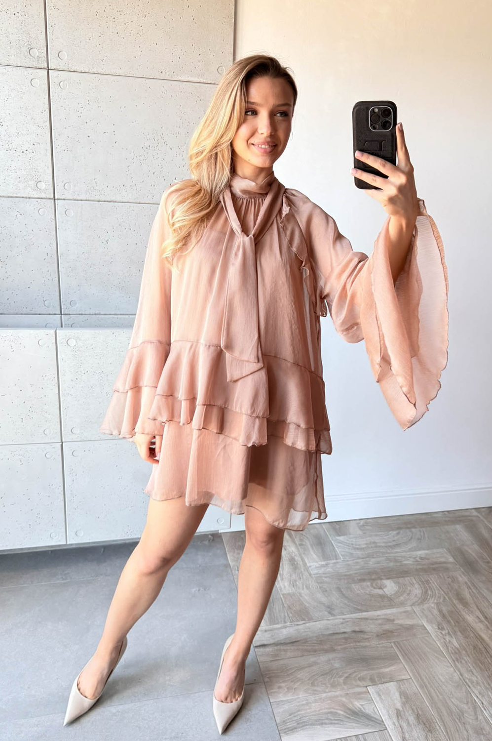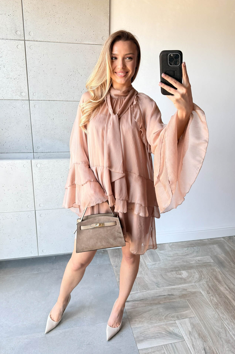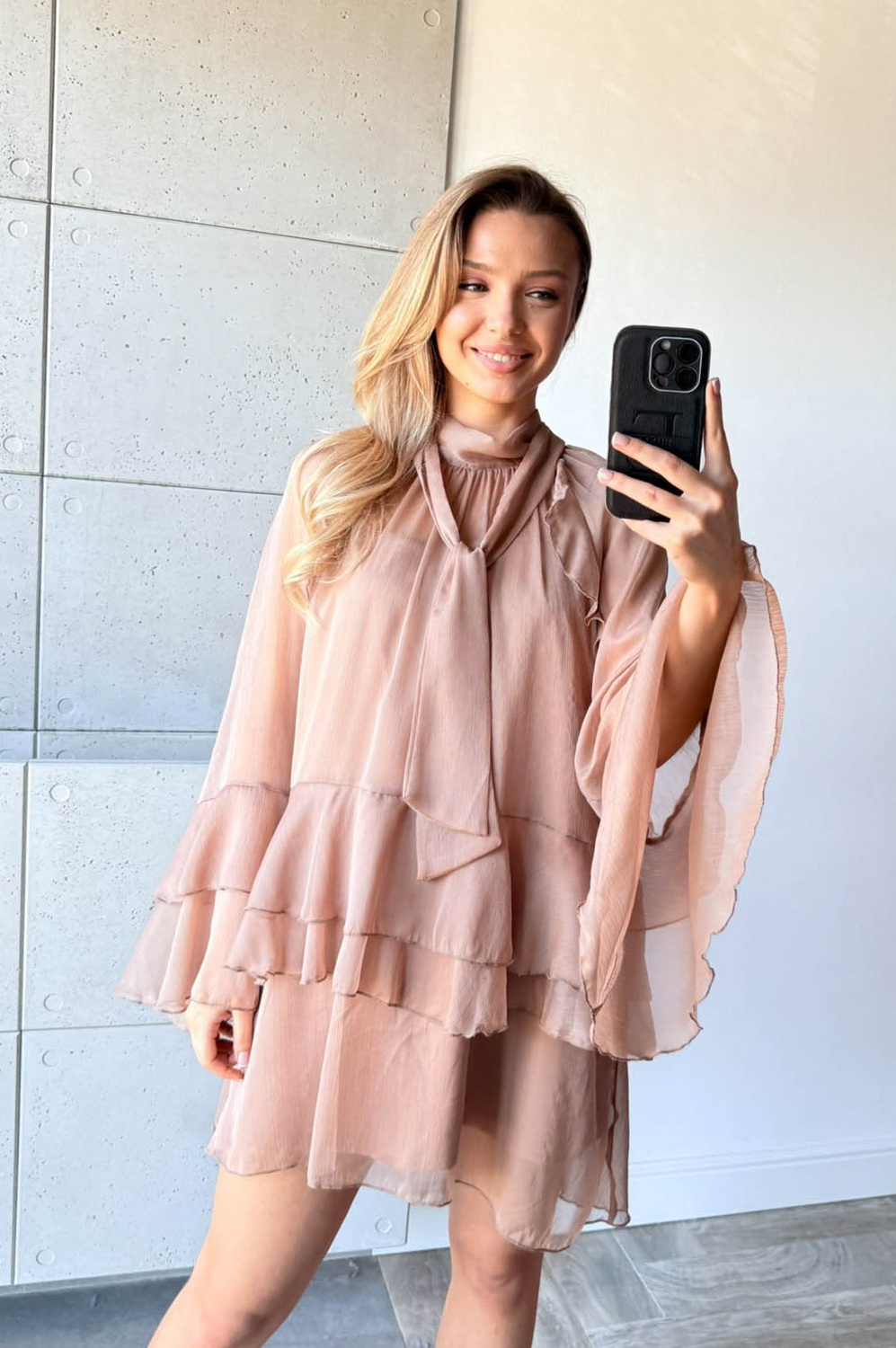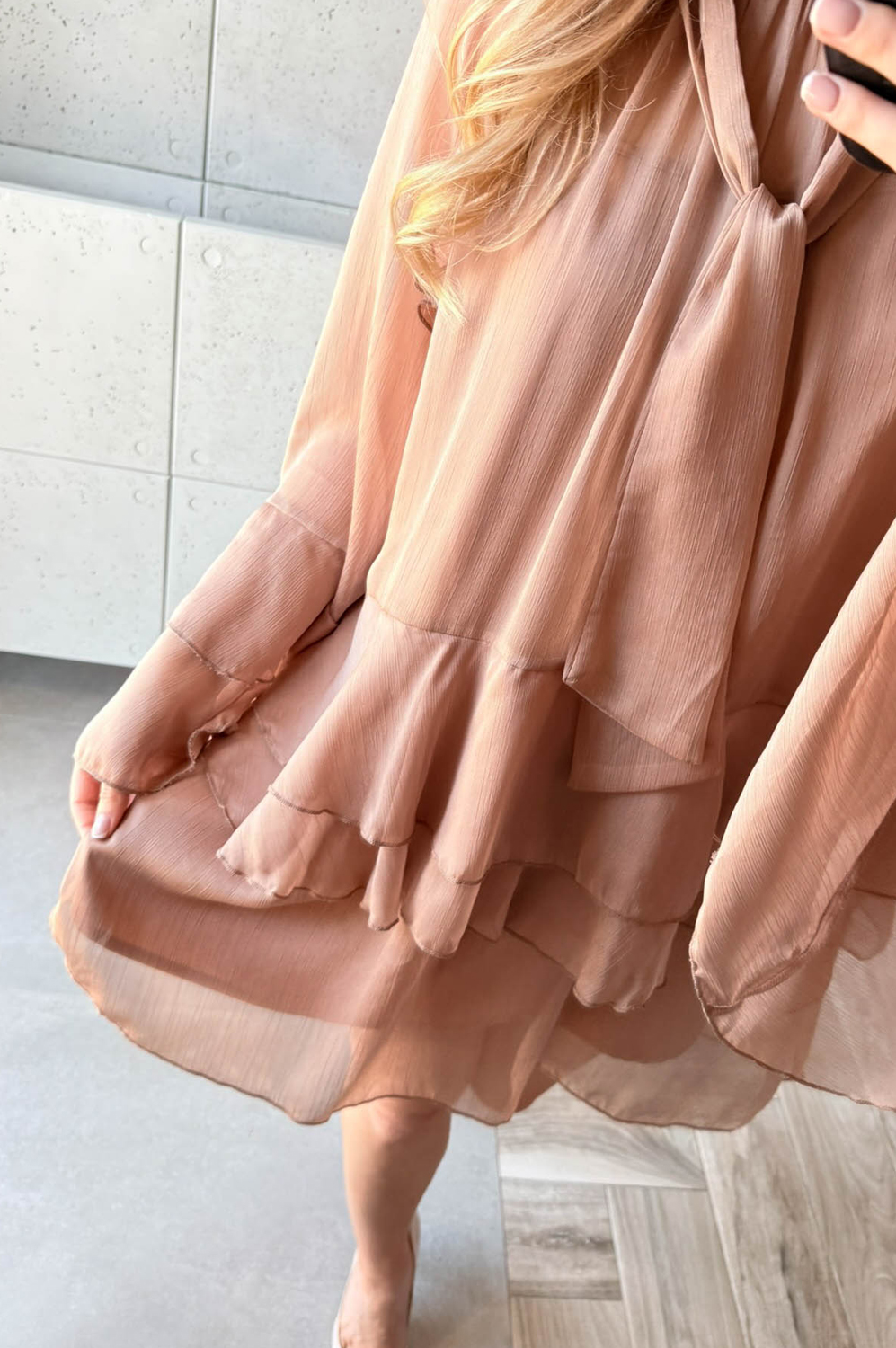 Sukienka KARMELOWA BEZA199.00 zł Najniższa cena towaru, która obowiązywała w okresie 30 dni przed zastosowaniem obniżki: 199.00 zł Opis Sukienka w kolorze karmelowym charakteryzuje się warstwowym szyfonem z falbanami oraz lużnym krojem z szerokimi rękawami. WYMIARY: S/M dł-92,szer podzsewka 110 M/L dł-92,szer podszewka 114