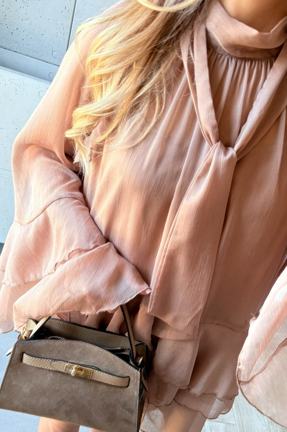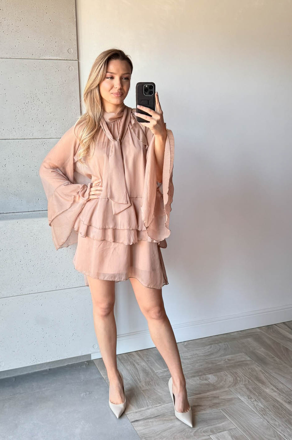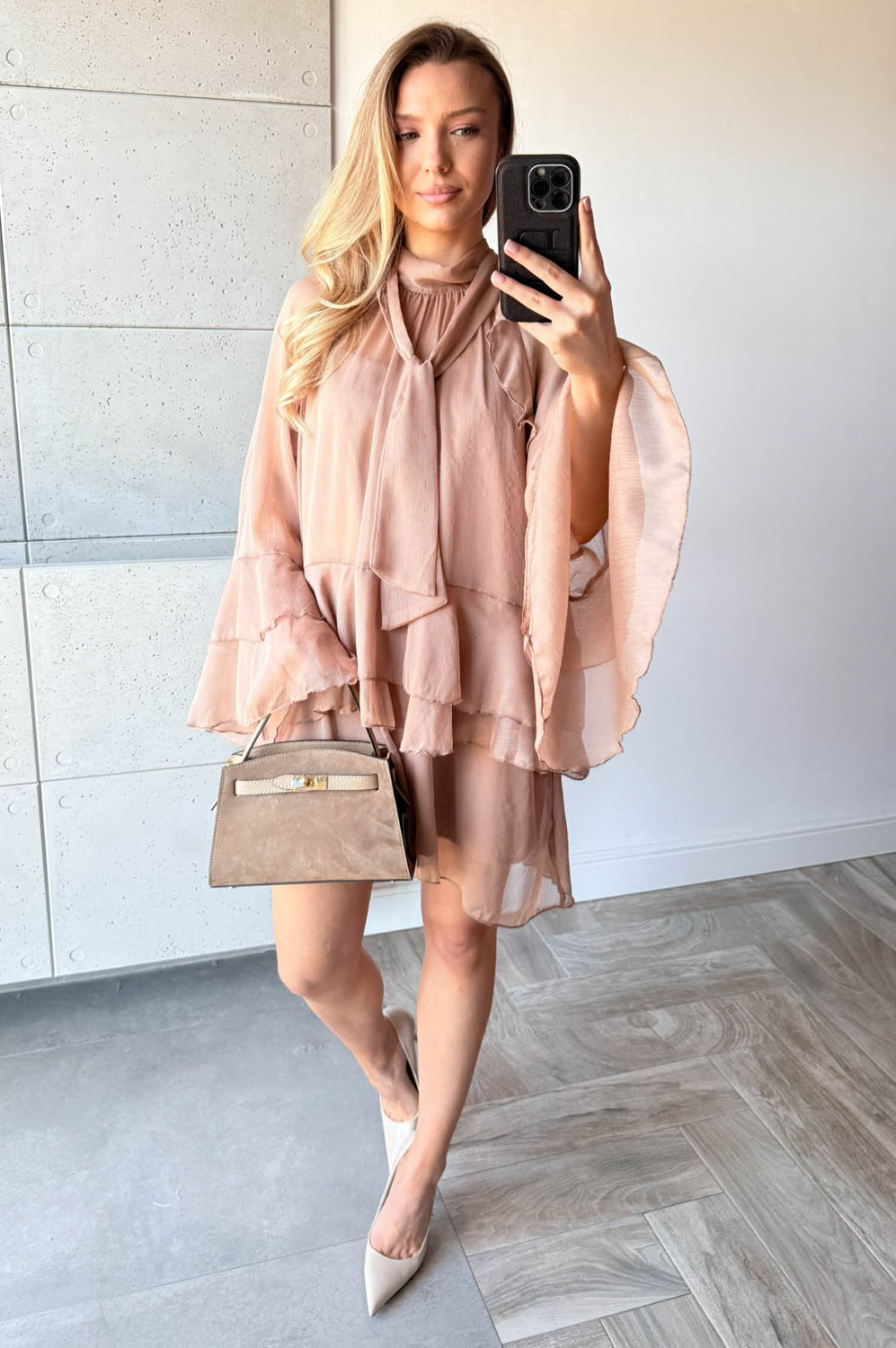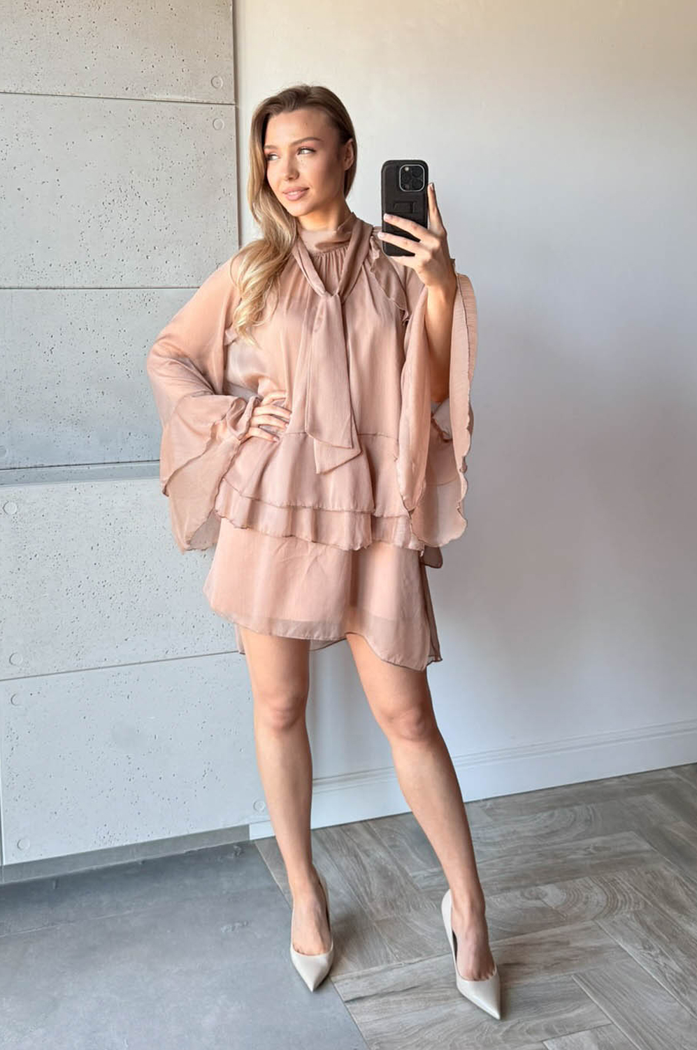 Sukienka KARMELOWA BEZA199.00 zł Najniższa cena towaru, która obowiązywała w okresie 30 dni przed zastosowaniem obniżki: 199.00 zł Opis Sukienka w kolorze karmelowym charakteryzuje się warstwowym szyfonem z falbanami oraz lużnym krojem z szerokimi rękawami. WYMIARY: S/M dł-92,szer podzsewka 110 M/L dł-92,szer podszewka 114