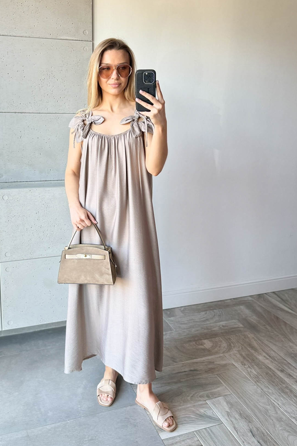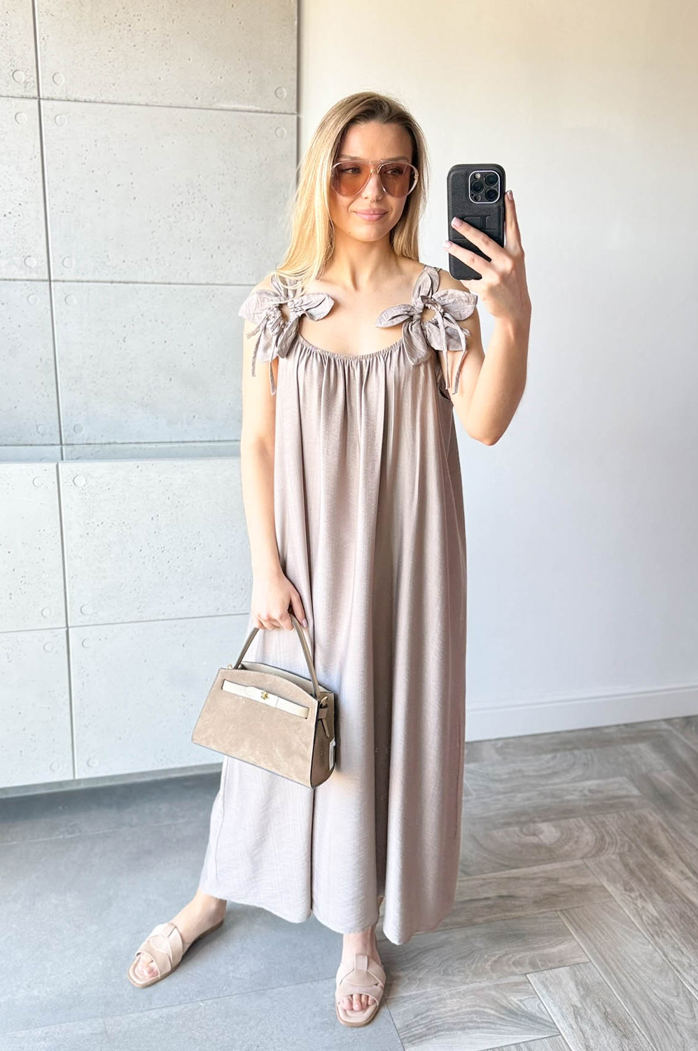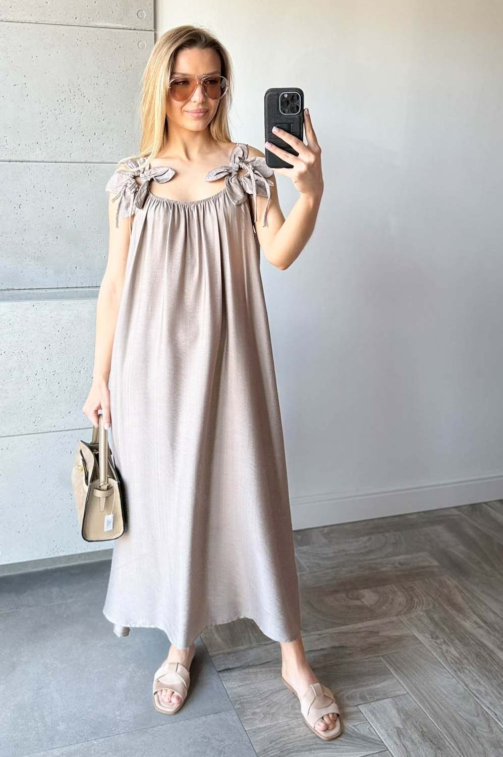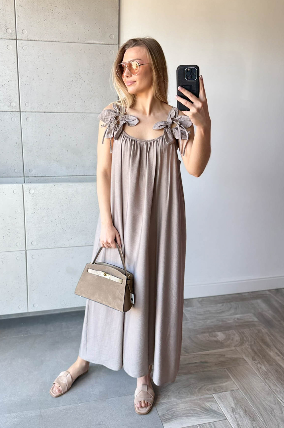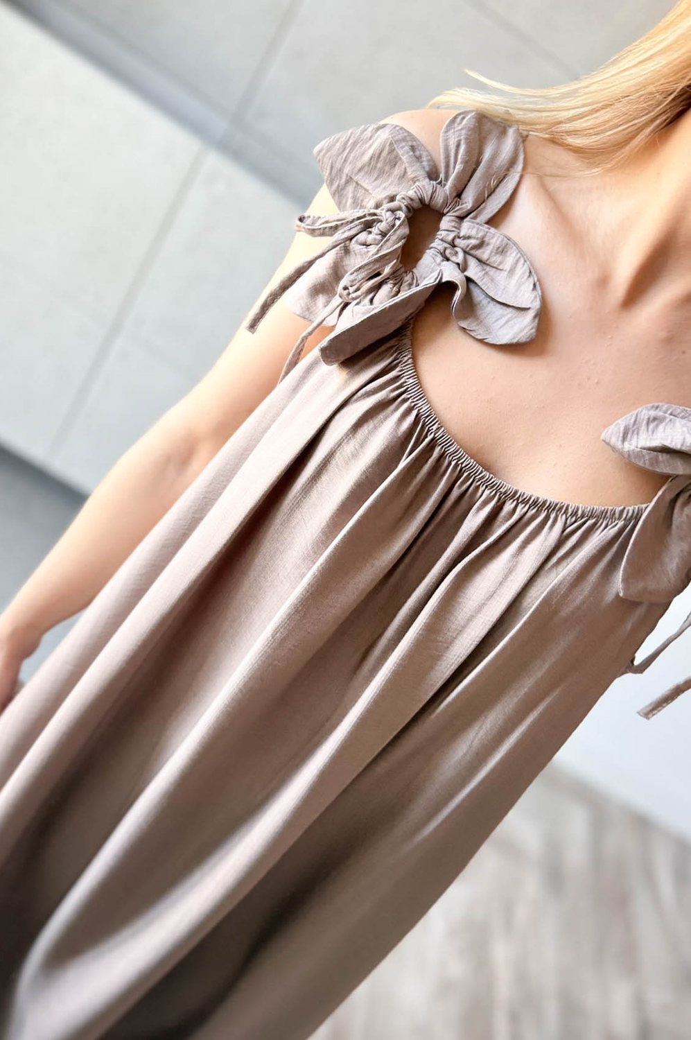 Sukienka KWIAT LOTOSU fango159.00 zł Najniższa cena towaru, która obowiązywała w okresie 30 dni przed zastosowaniem obniżki: 150.00 zł Opis Sukienka długa wiskozowa z ozdobą na ramiączkach w formie kwiata. Dekolt z delikatną gumką, tył na gładko. WYMIARY: długość 134cm, szer 140cm SKŁAD: 85%wiskoza,15% poliamid