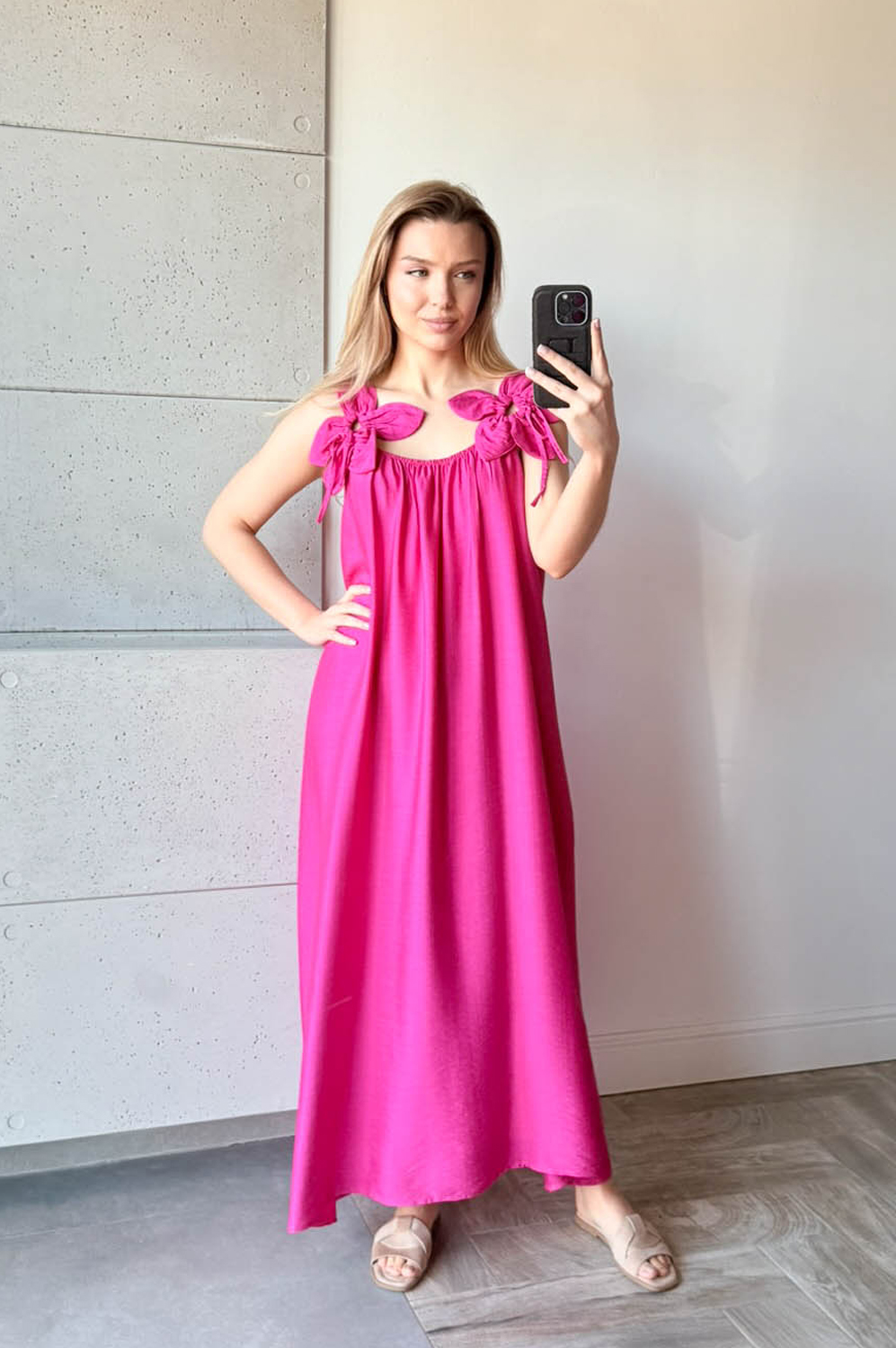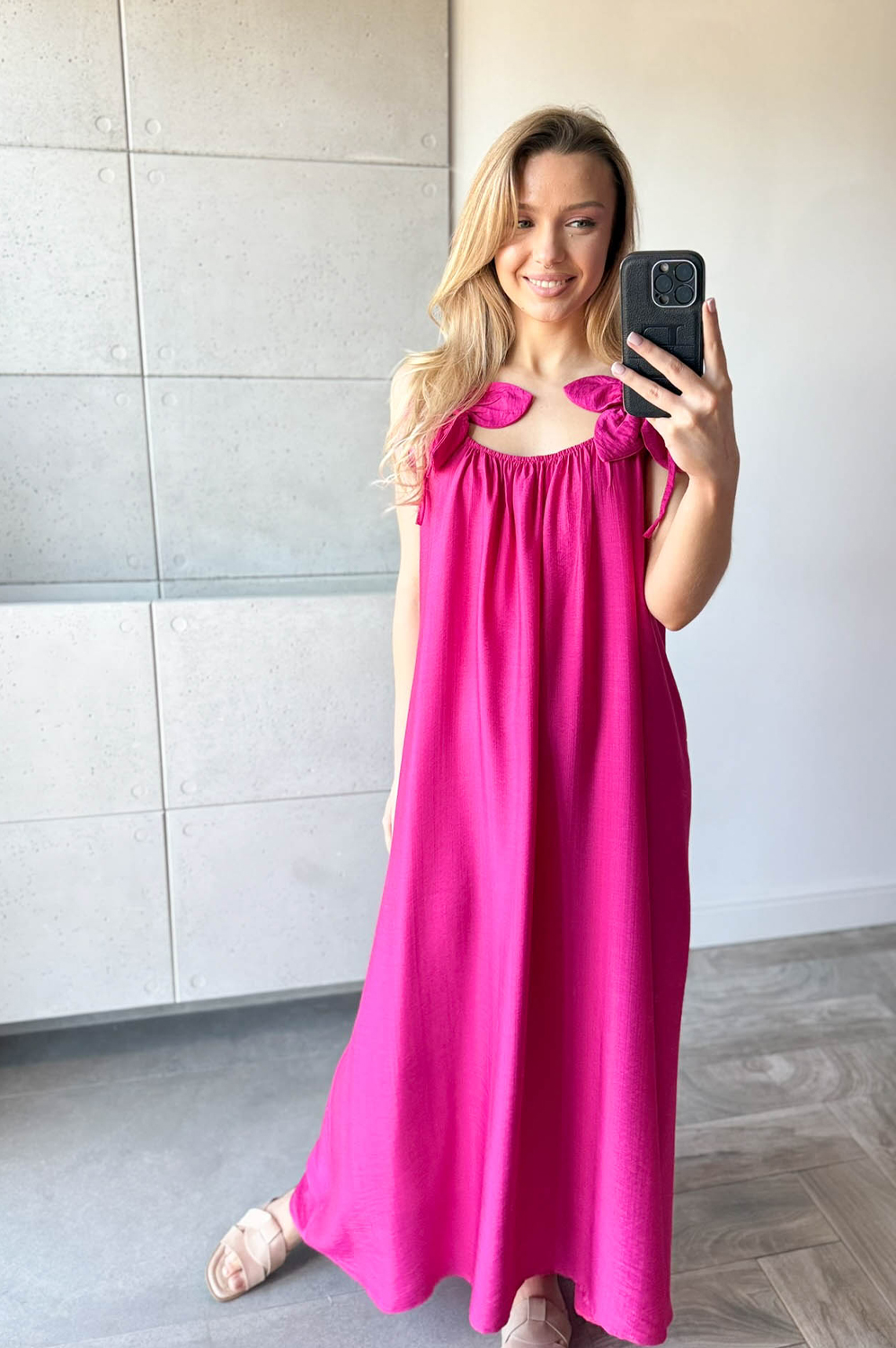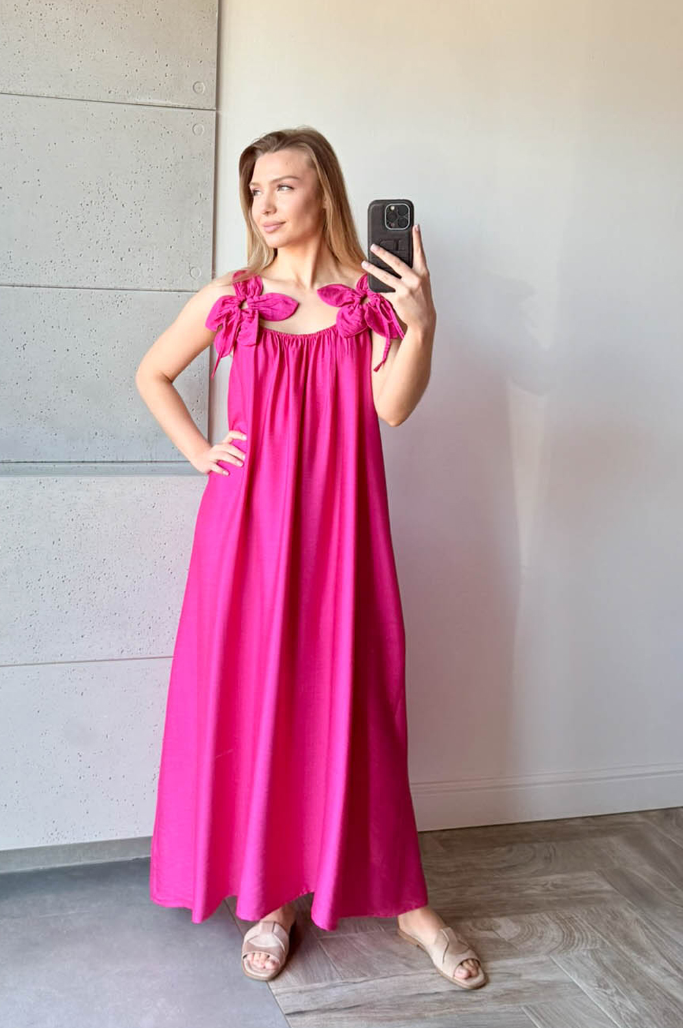 Sukienka KWIAT LOTOSU fuksja159.00 zł Najniższa cena towaru, która obowiązywała w okresie 30 dni przed zastosowaniem obniżki: 159.00 zł Opis Sukienka długa wiskozowa z ozdobą na ramiączkach w formie kwiata. Dekolt z delikatną gumką, tył na gładko. WYMIARY: długość 134cm, szer 140cm SKŁAD: 85%wiskoza,15% poliamid