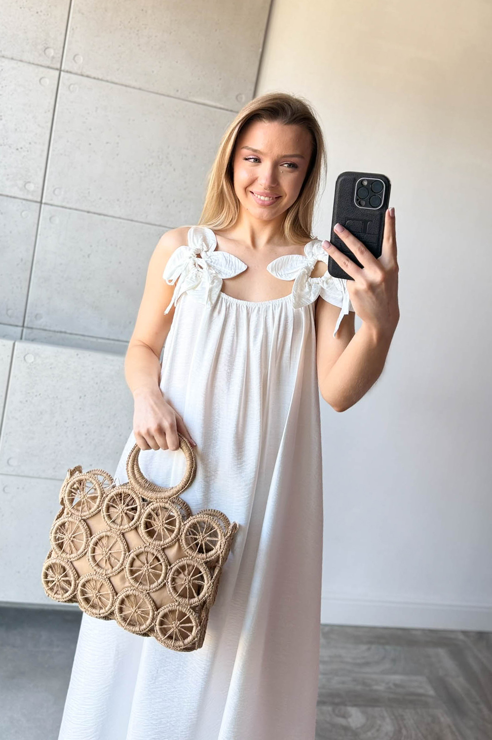 Sukienka KWIAT LOTOSU śmietanka159.00 zł Najniższa cena towaru, która obowiązywała w okresie 30 dni przed zastosowaniem obniżki: 159.00 zł Opis Sukienka długa wiskozowa z ozdobą na ramiączkach w formie kwiata. Dekolt z delikatną gumką, tył na gładko. WYMIARY: długość 134cm, szer 140cm SKŁAD: 85%wiskoza,15% poliamid