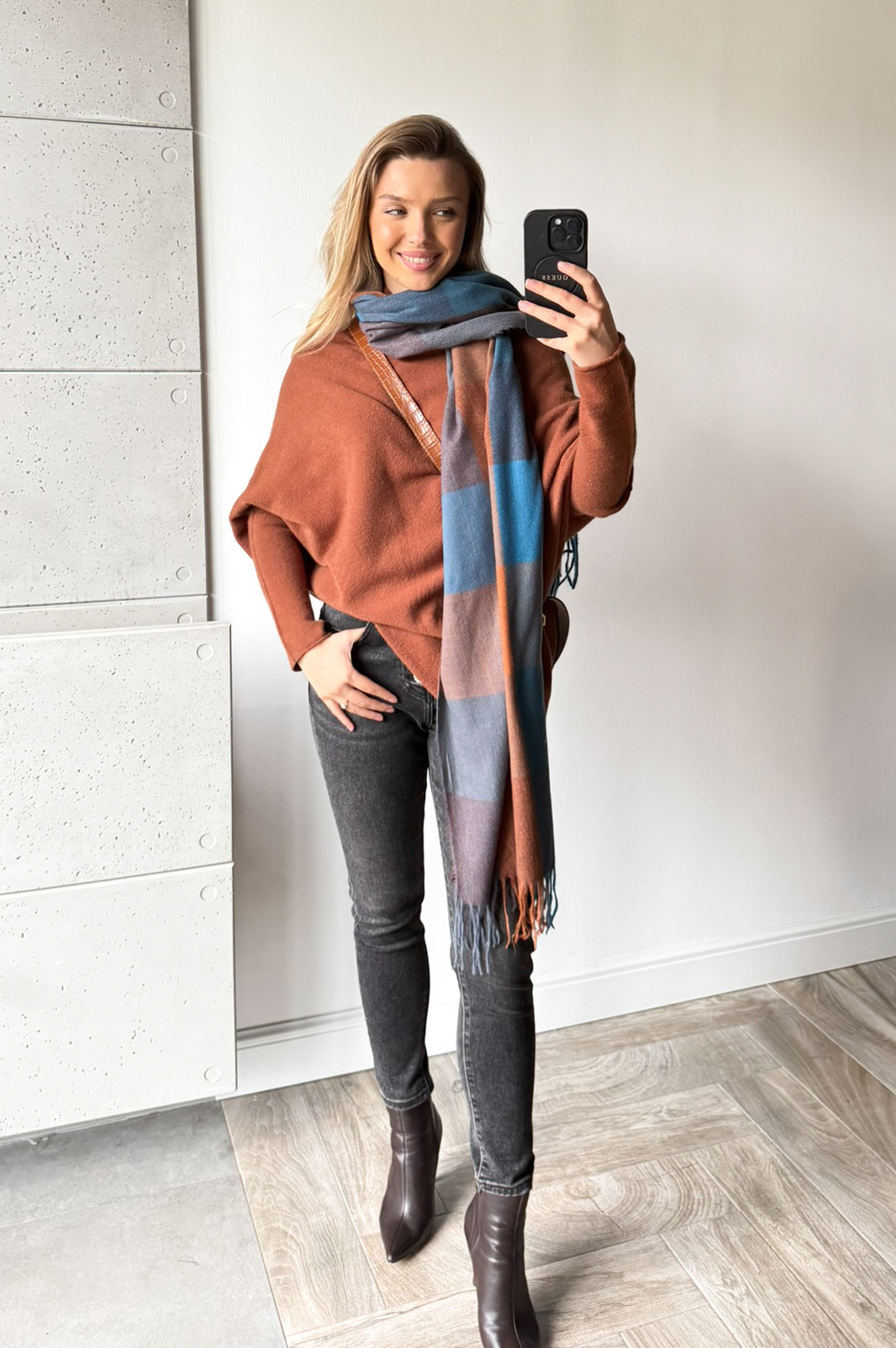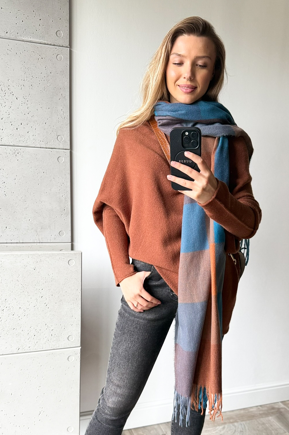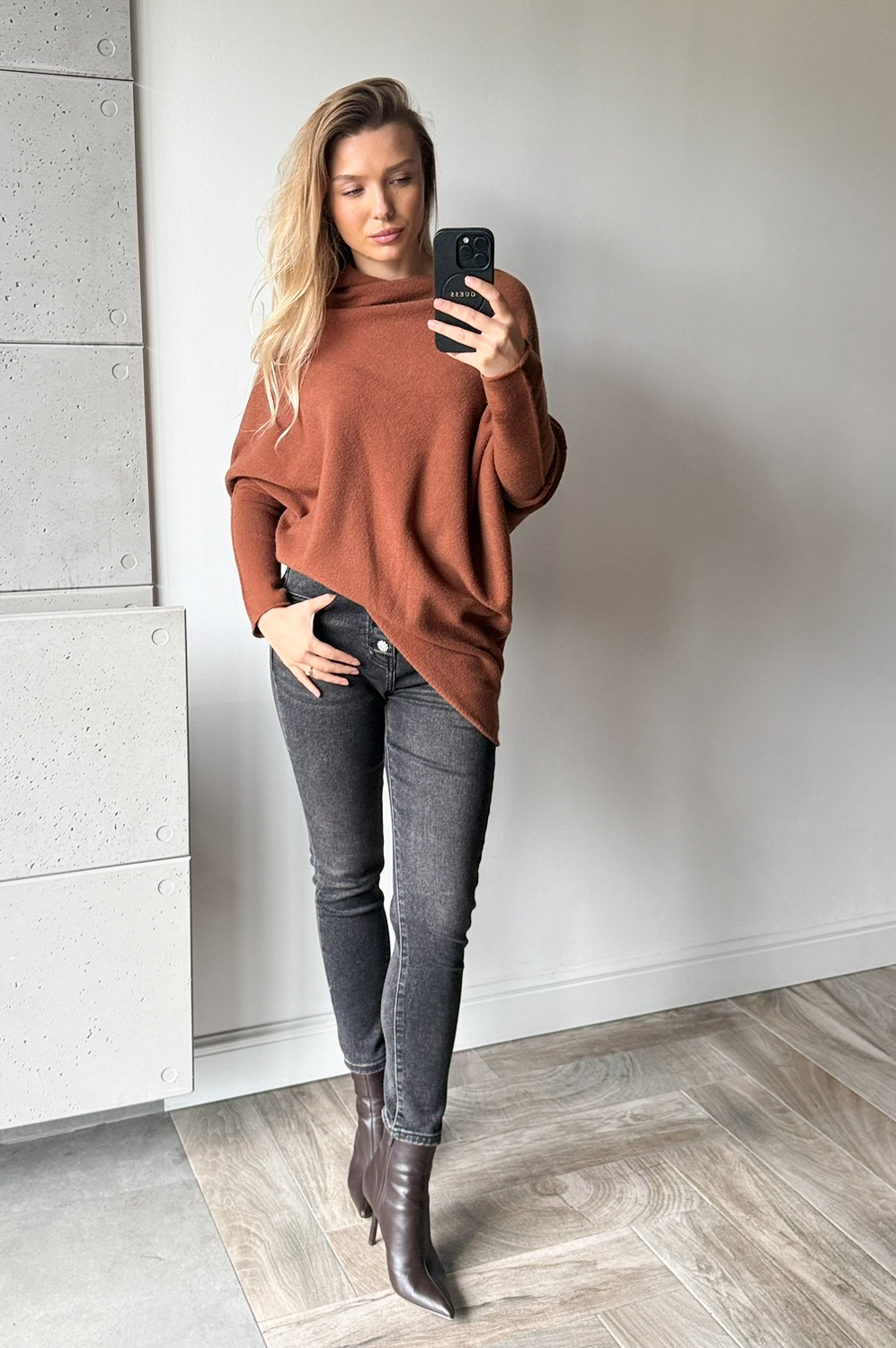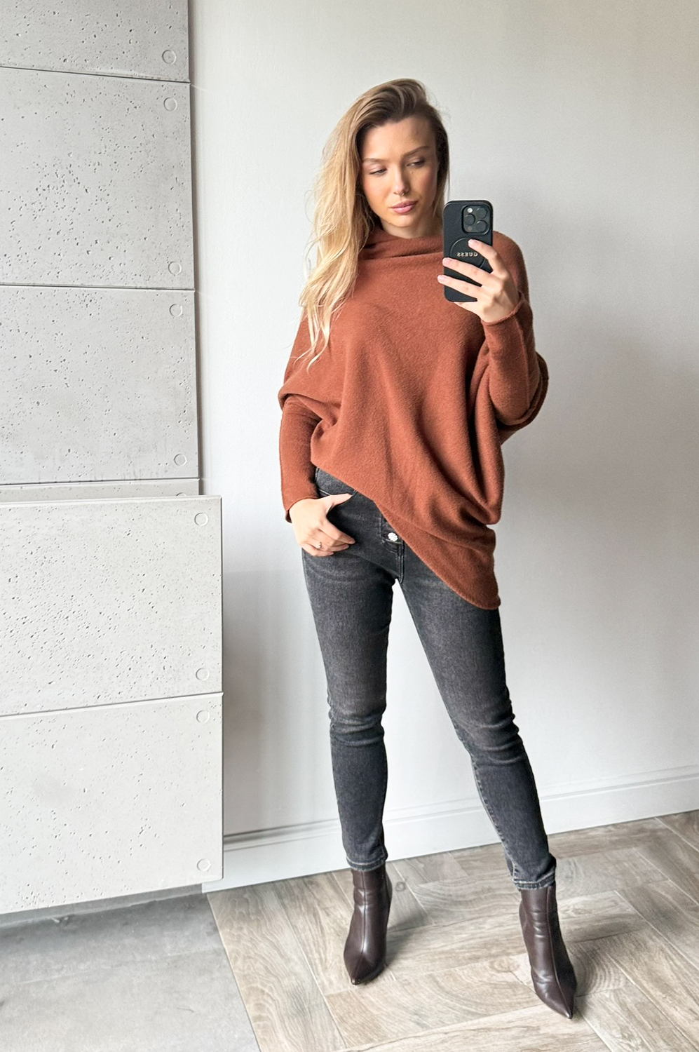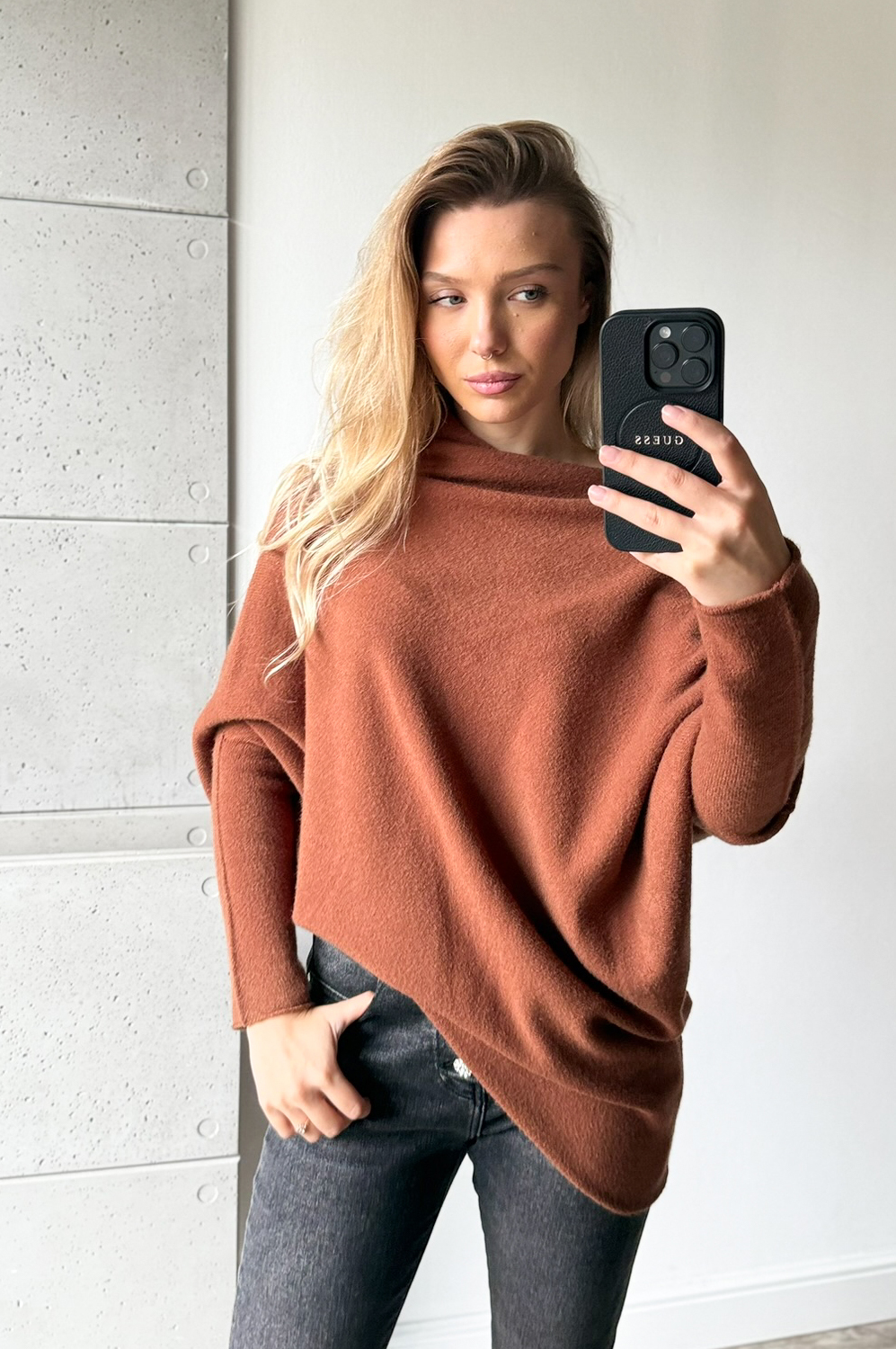 Sweterek ASYMETRIX koniak169.00 zł Najniższa cena towaru, która obowiązywała w okresie 30 dni przed zastosowaniem obniżki: 169.00 zł Opis Sweterek o asymetrycznym luźnym kroju - można go nosić jako tunikę lub krótszy sweter. Rewelacyjnie układa się na każdej sylwetce. Sweterek wykonany jest z przemiłej w dotyku, elastycznej dzianiny. SKŁAD : 42% wiskoza 30% poliamid 28% poliester