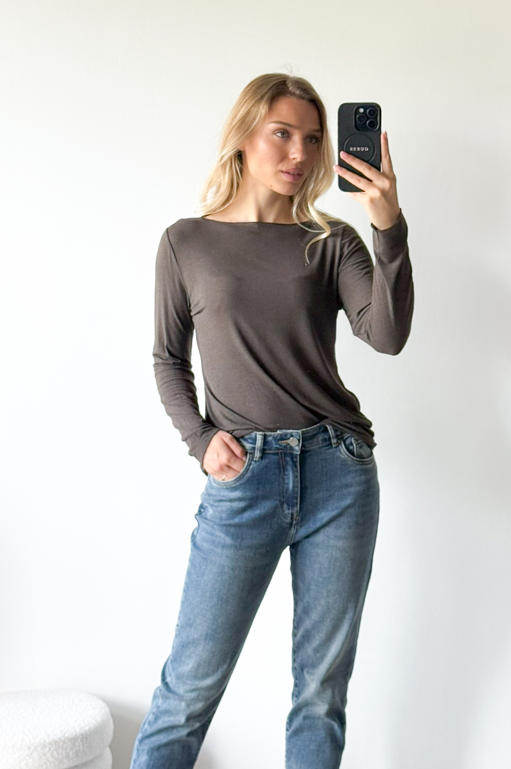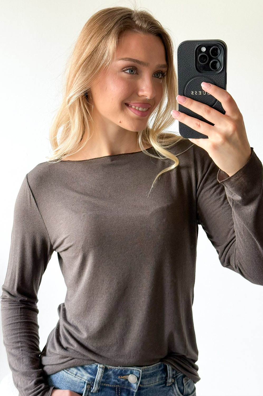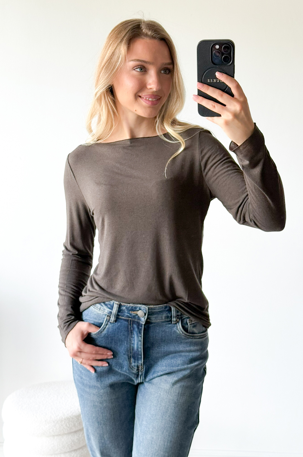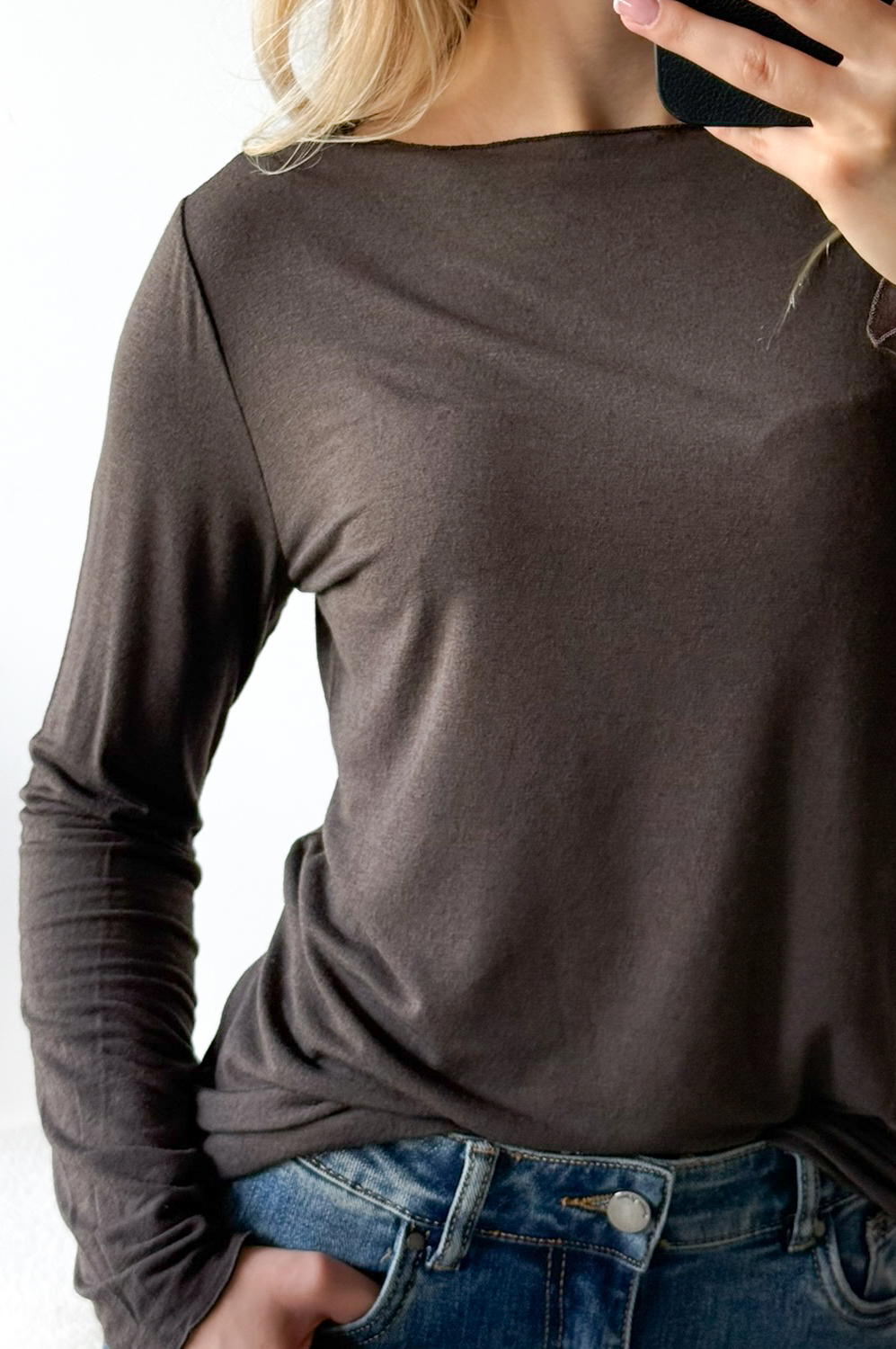 Bluzka BASIC KASZMIR czekolada109.00 zł Najniższa cena towaru, która obowiązywała w okresie 30 dni przed zastosowaniem obniżki: 109.00 zł Opis Klasyczny BASIC. Bluzka dopaowana, elastyczna z dzianiny. Dzianina bardzo elastyczna, cienka i miękka.