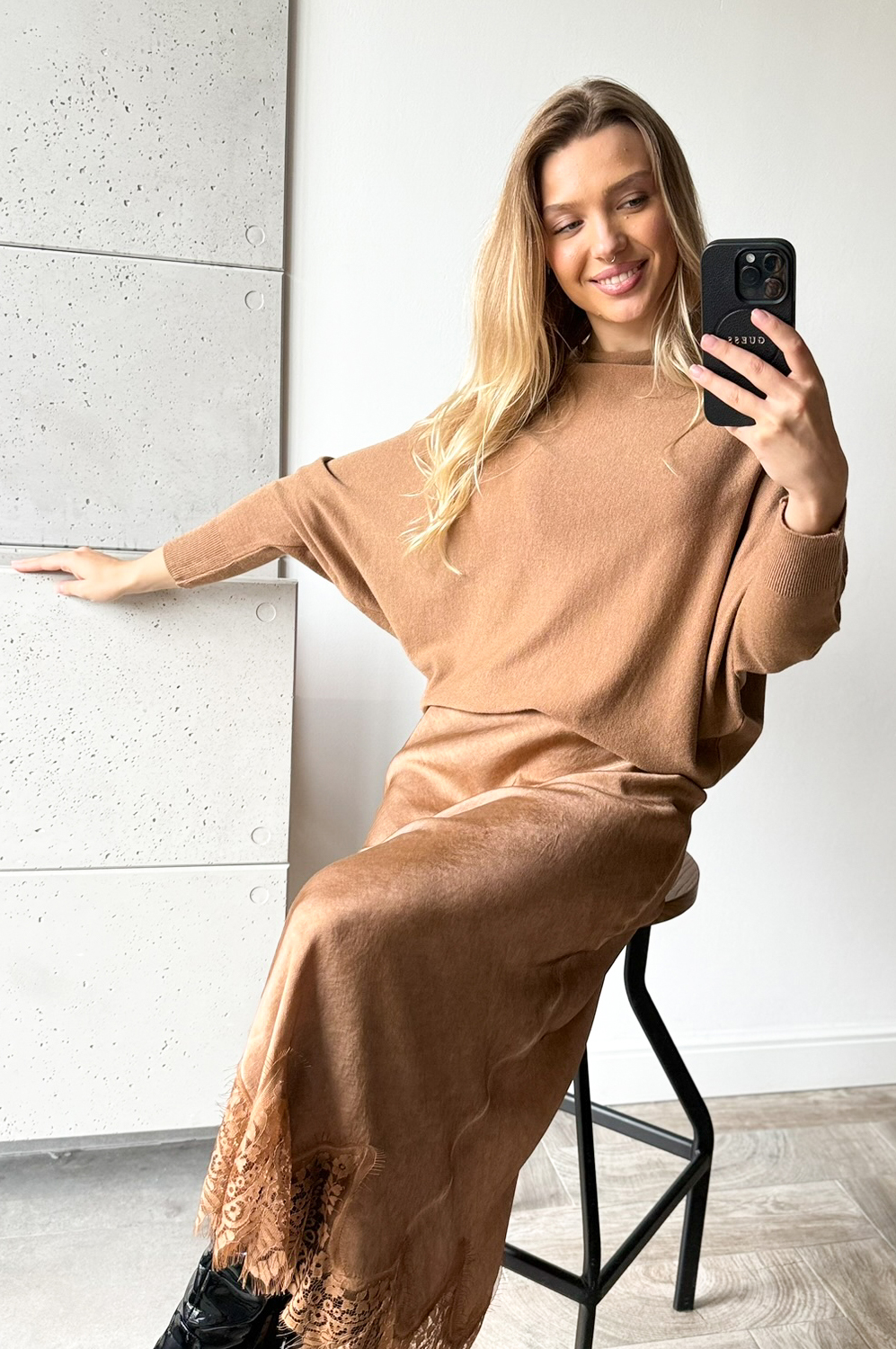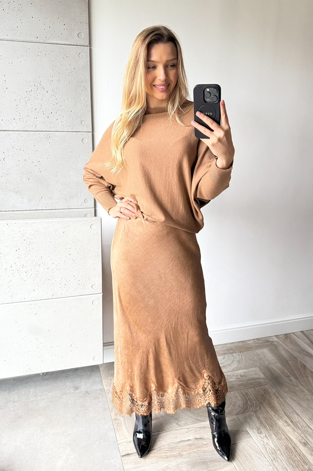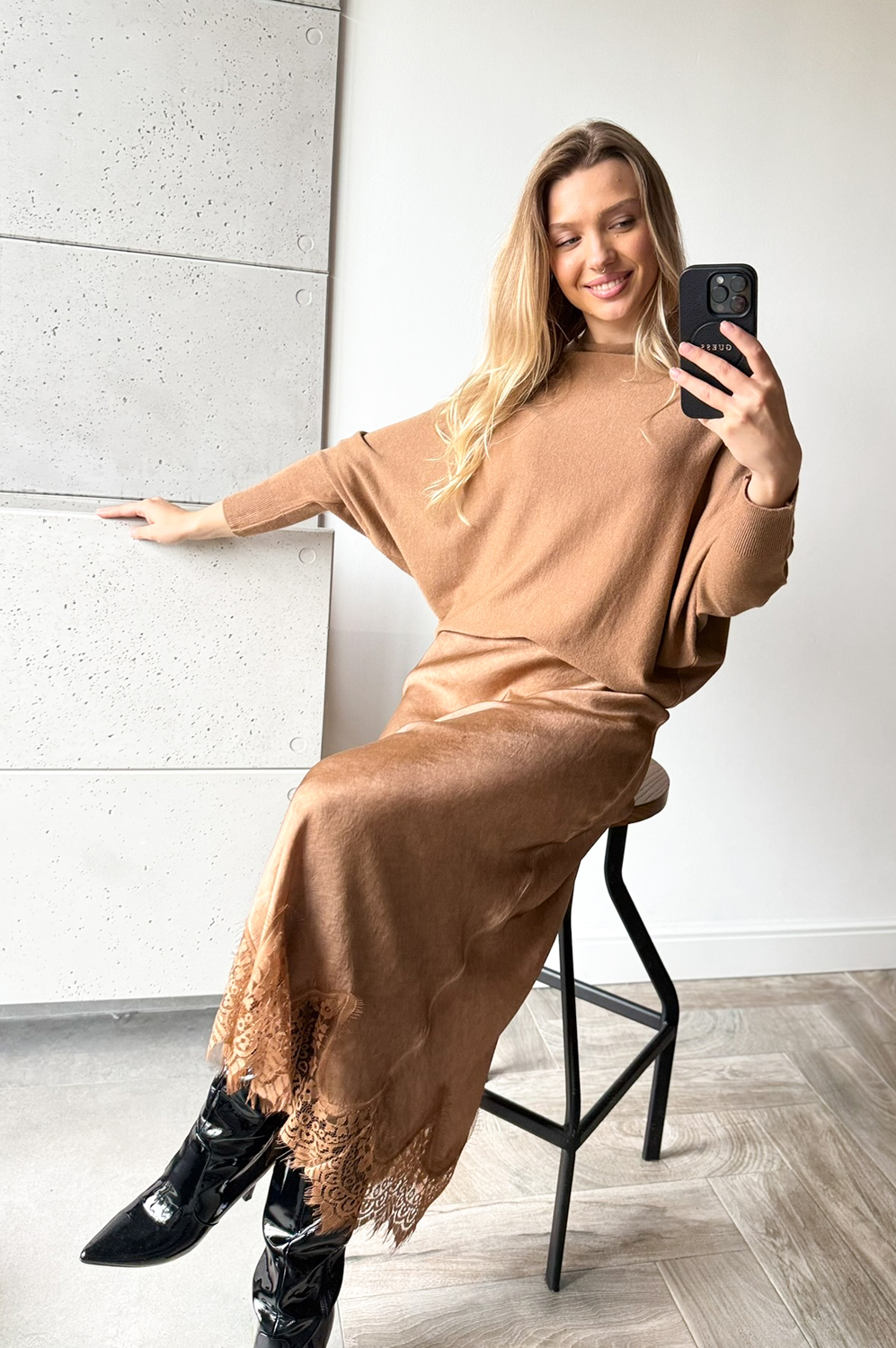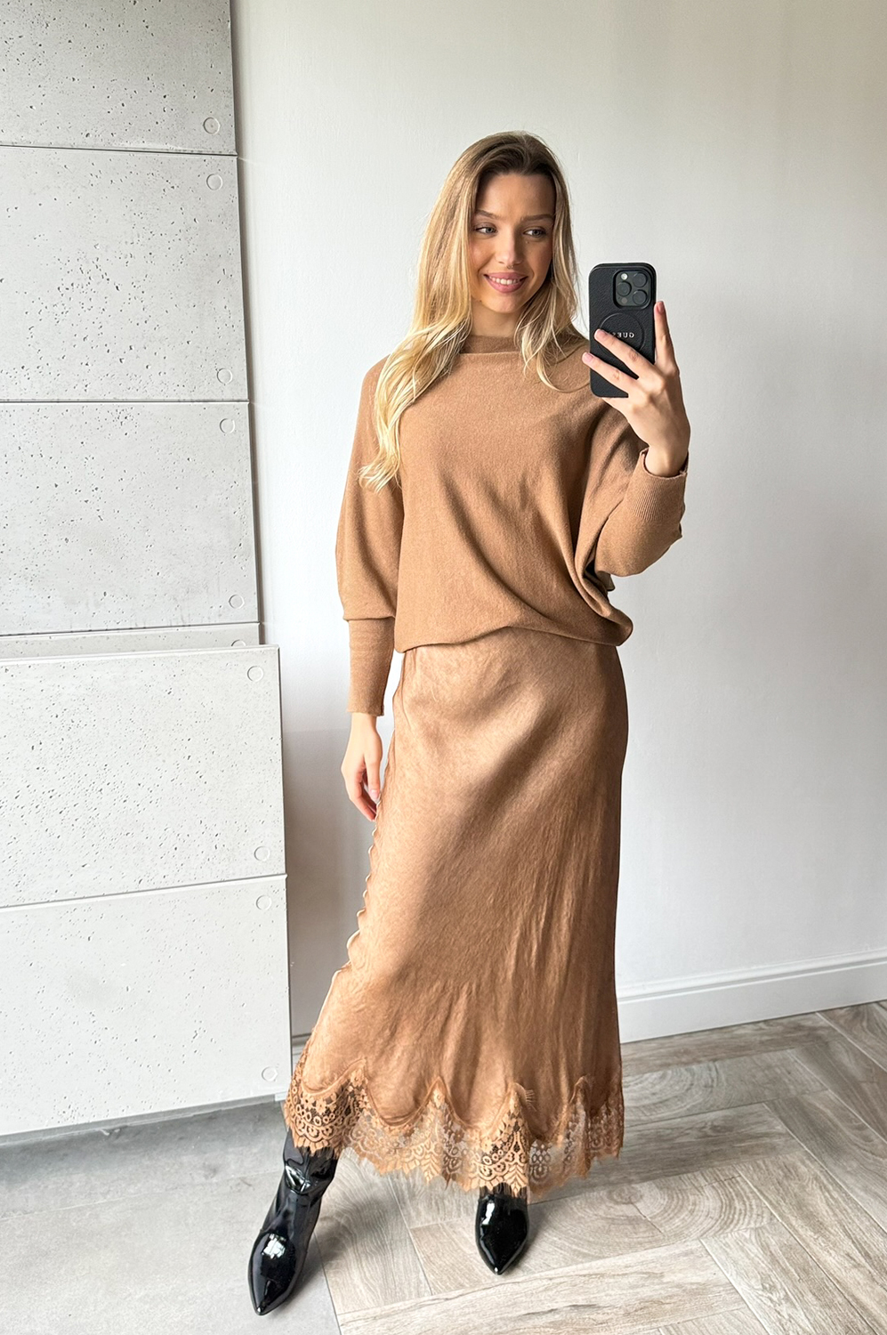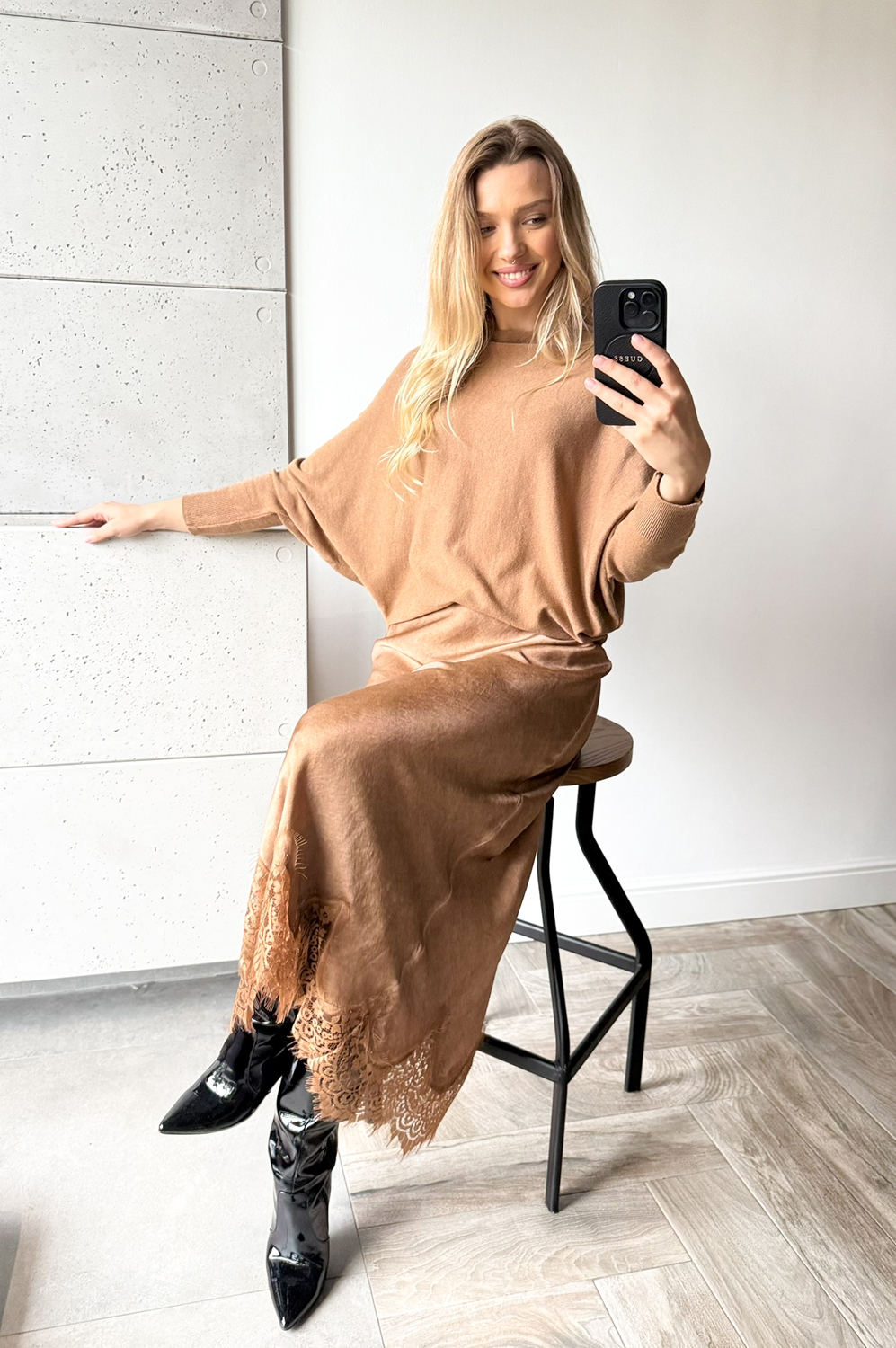 Spódniczka SATYNOWA PRZECIERANA Z KORONKĄ karmel149.00 zł Najniższa cena towaru, która obowiązywała w okresie 30 dni przed zastosowaniem obniżki: 149.00 zł Opis Spódnica w kolorze koniaku ,z ozdobną gumką w pasie,cala po skosie.