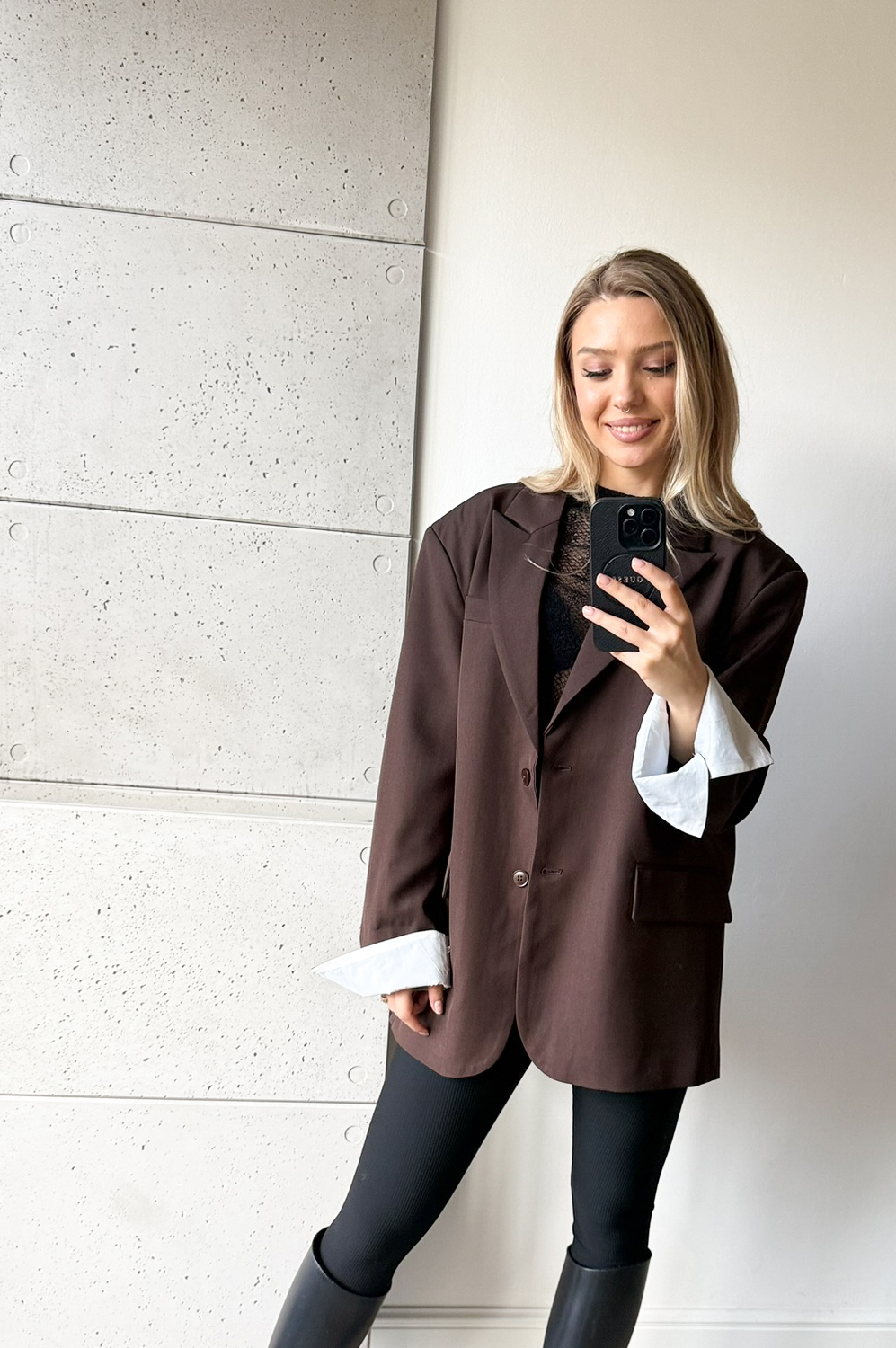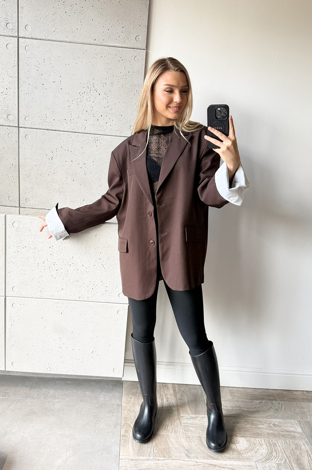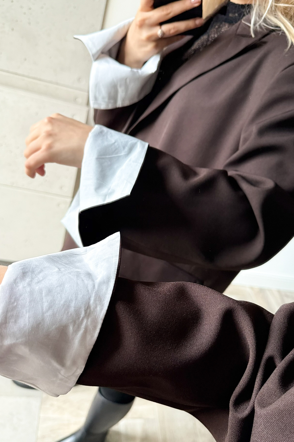 Marynarka CZEKOLADKA Z MANKIETEM ŚMIETANKOWYM219.00 zł Najniższa cena towaru, która obowiązywała w okresie 30 dni przed zastosowaniem obniżki: 219.00 zł Opis Zwrot ZWROTY