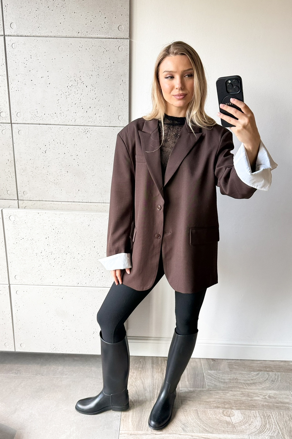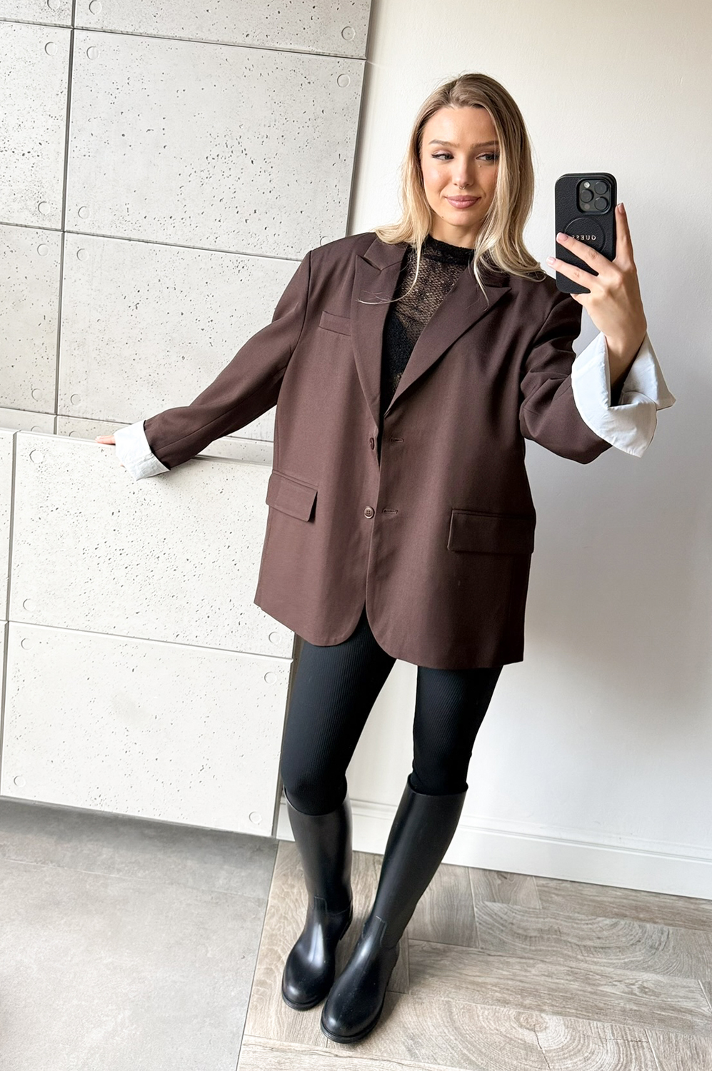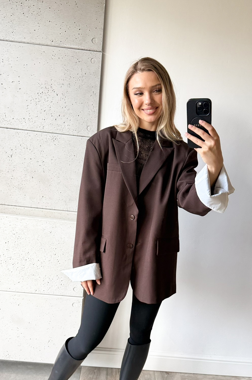 Marynarka CZEKOLADKA Z MANKIETEM ŚMIETANKOWYM219.00 zł Najniższa cena towaru, która obowiązywała w okresie 30 dni przed zastosowaniem obniżki: 219.00 zł Opis Zwrot ZWROTY