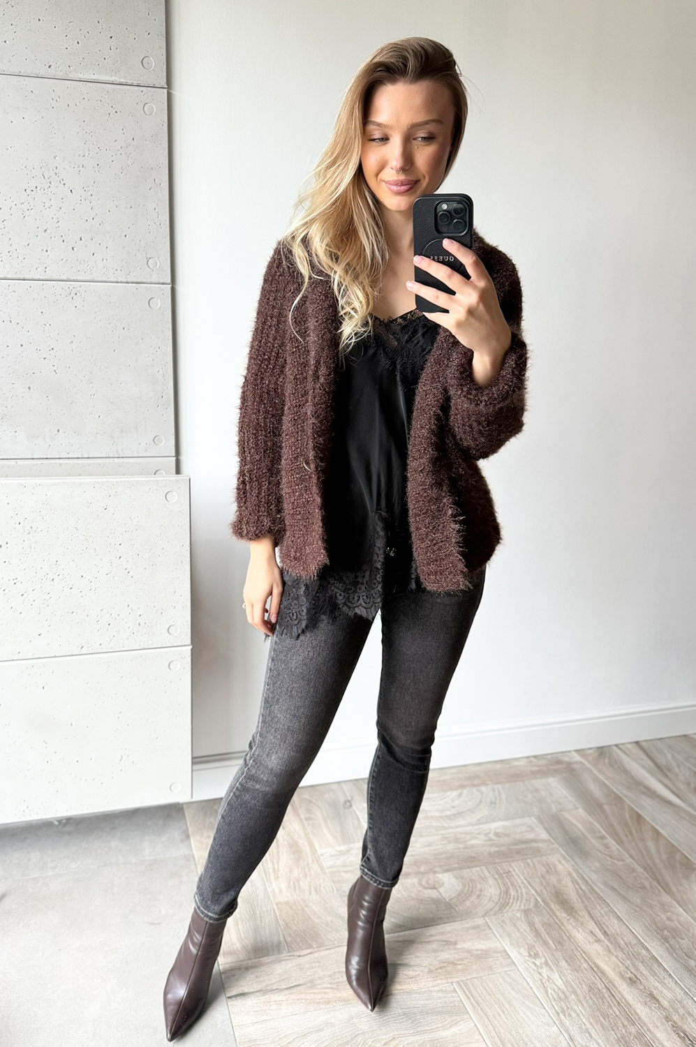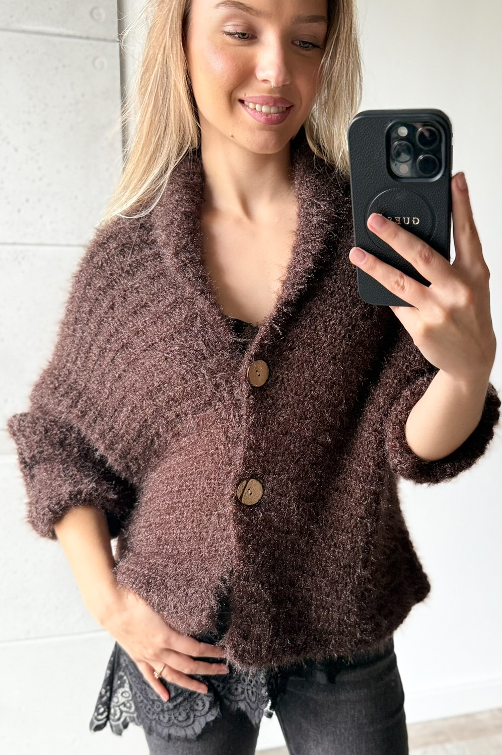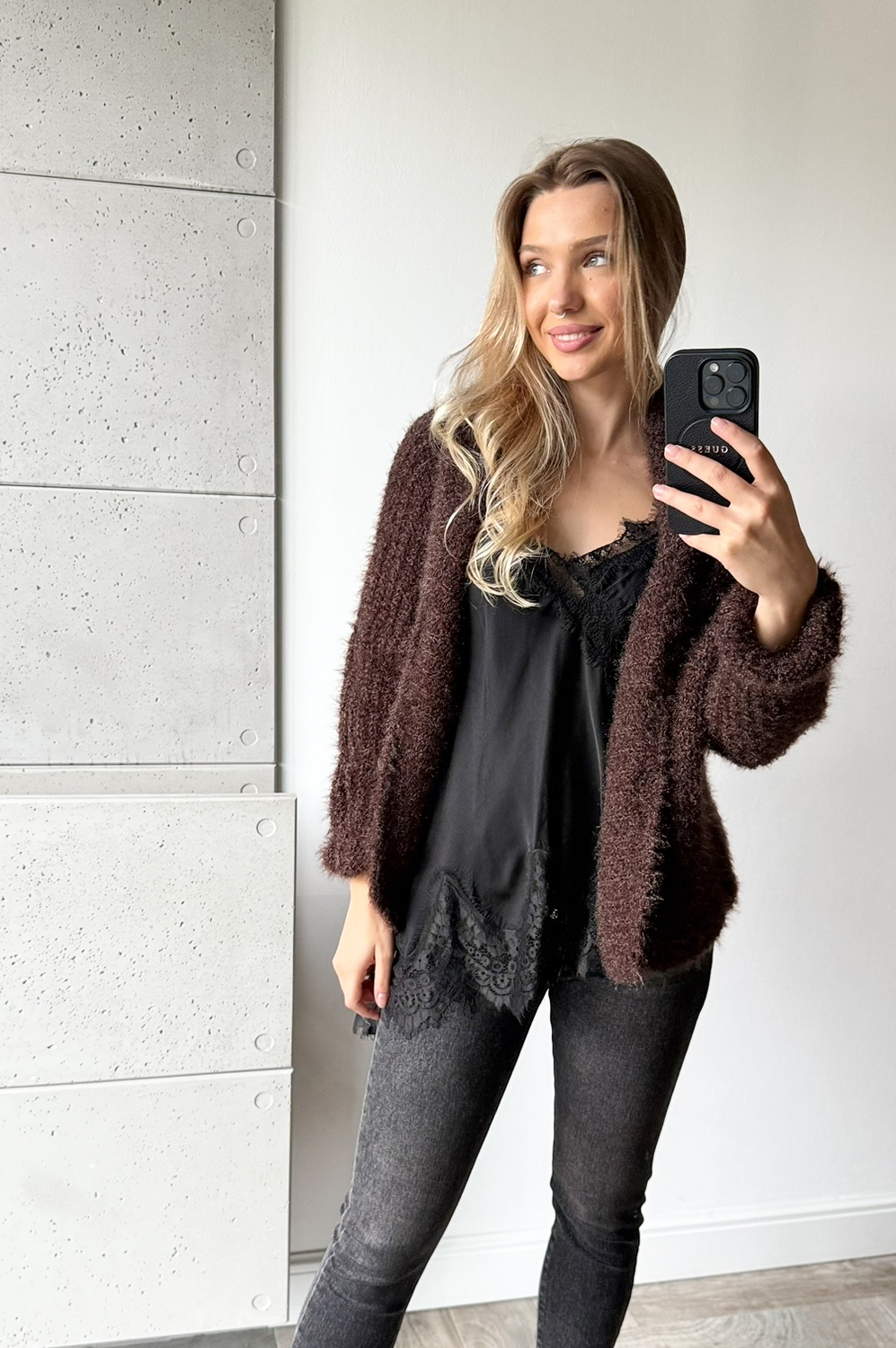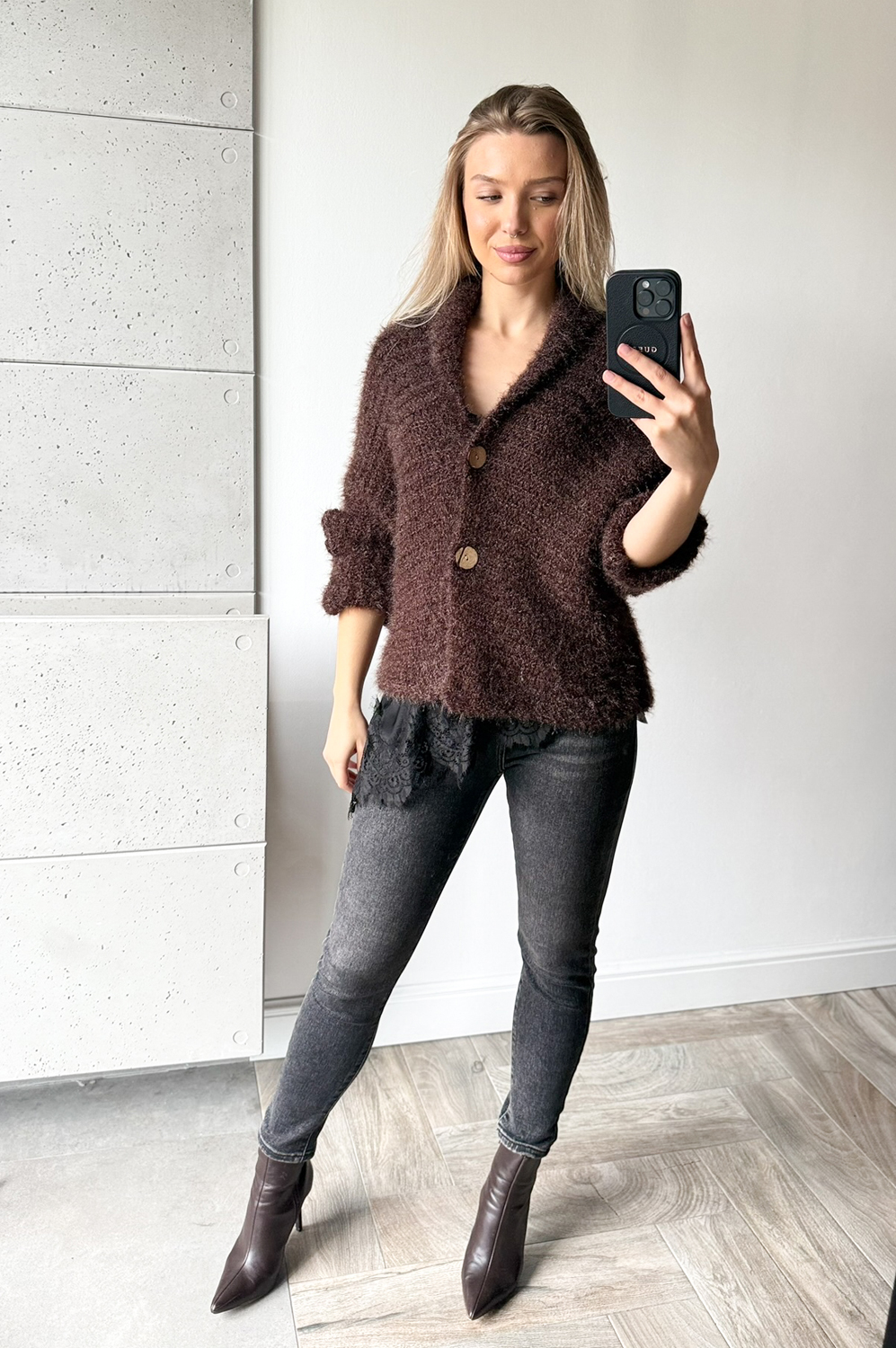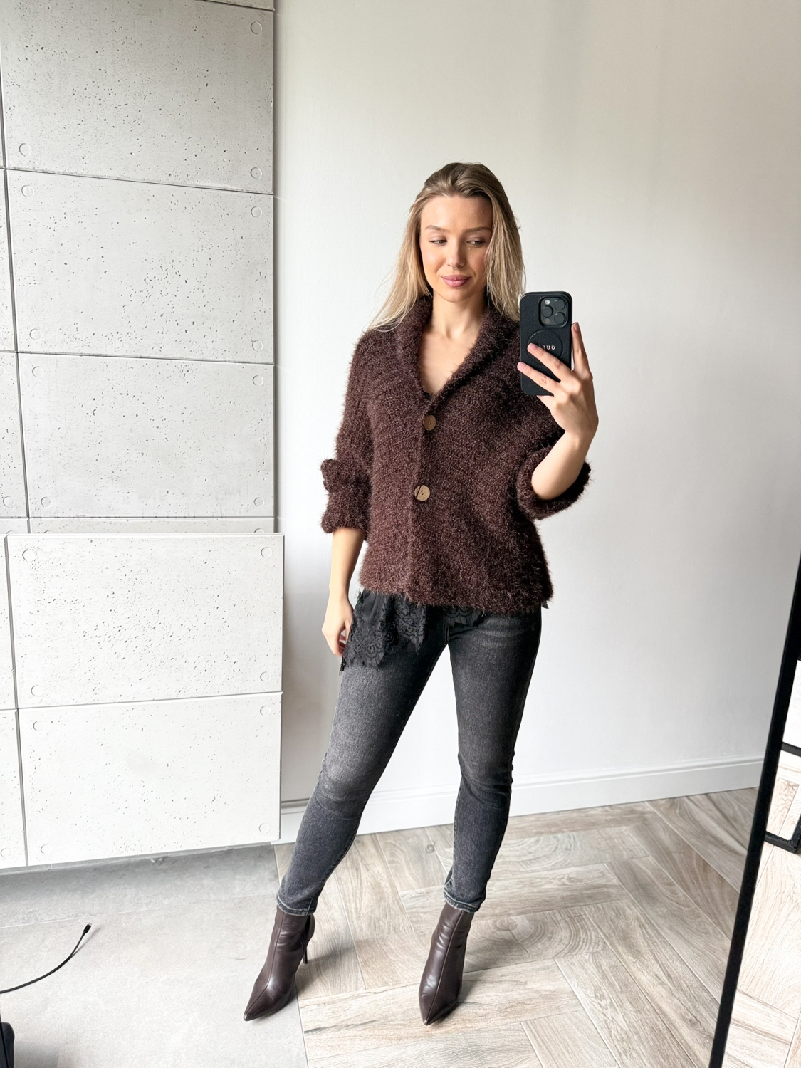 Sweterek KARDIGAN WŁOCHACZ CZEKOLADOWY NA GUZIKI129.00 zł Najniższa cena towaru, która obowiązywała w okresie 30 dni przed zastosowaniem obniżki: 179.00 zł Opis Sweterek o luźnym kroju - można go nosić jako narzutkę. Rewelacyjnie układa się na każdej sylwetce. Sweterek wykonany jest z przemiłej w dotyku, elastycznej dzianiny. SKŁAD : 50% poliamid, 50% poliester