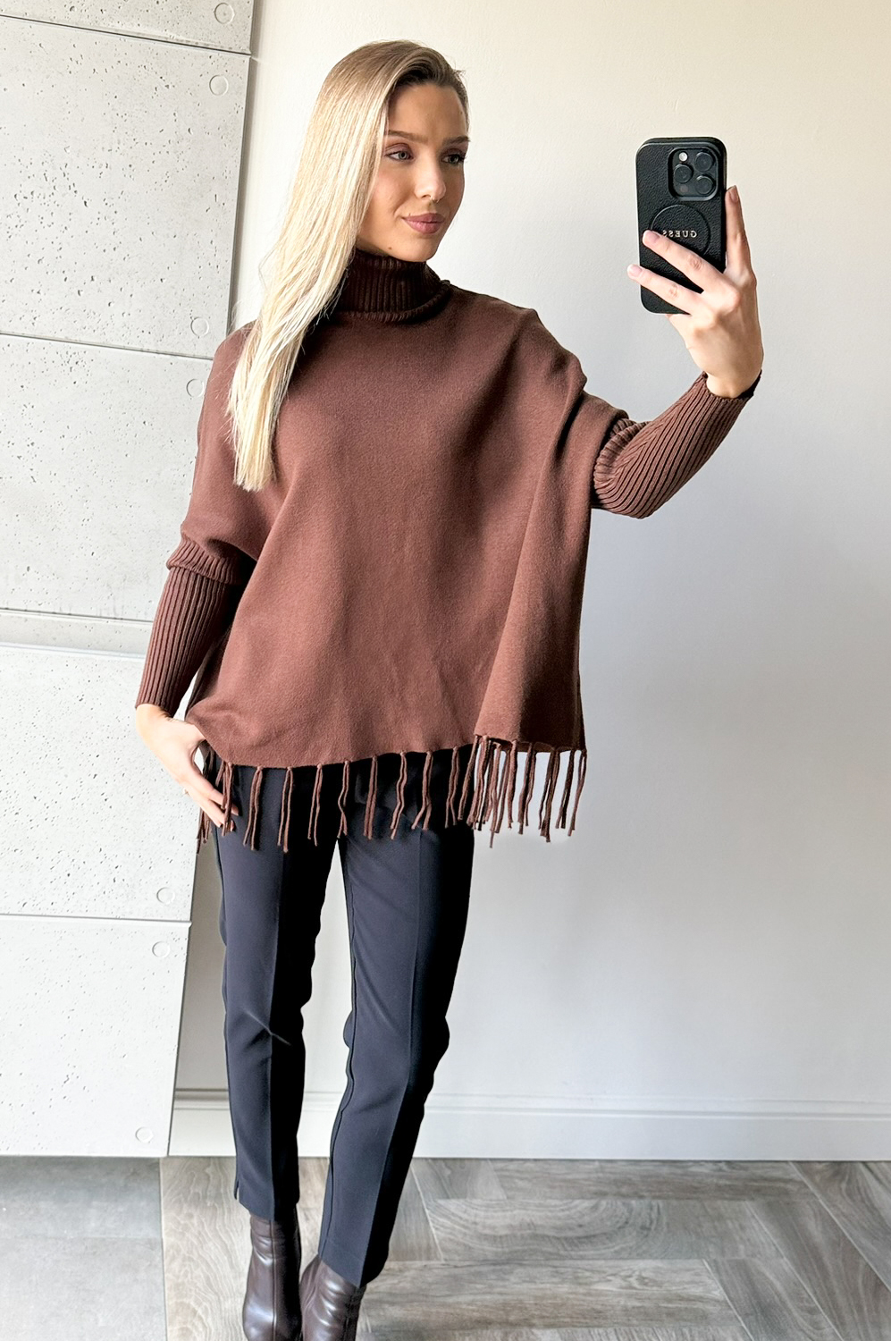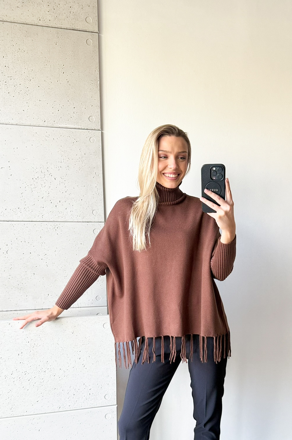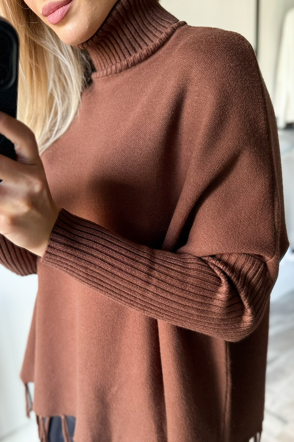 Sweterek KIMONO FRĘDZLE LONG ciemny karmel169.00 zł Najniższa cena towaru, która obowiązywała w okresie 30 dni przed zastosowaniem obniżki: 169.00 zł Opis Zwrot ZWROTY